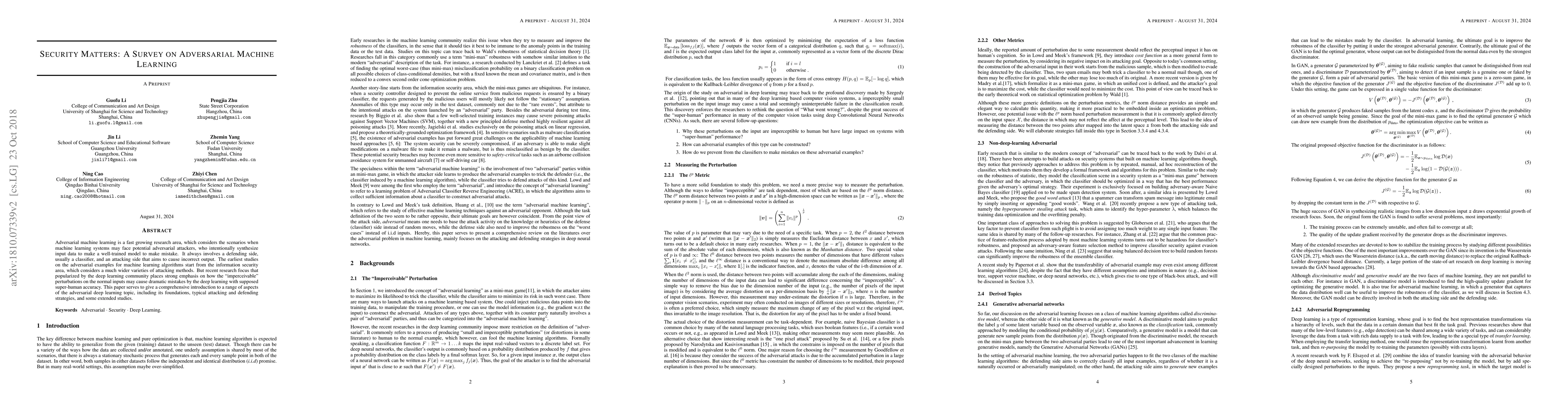 Adversarial machine learning is a fast growing research area, which considers the scenarios when machine learning systems may face potential adversarial attackers, who intentionally synthesize input data to make a well-trained model to make mistake. It always involves a defending side, usually a classifier, and an attacking side that aims to cause incorrect output. The earliest studies on the adversarial examples for machine learning algorithms start from the information security area, which considers a much wider varieties of attacking methods. But recent research focus that popularized by the deep learning community places strong emphasis on how the "imperceivable" perturbations on the normal inputs may cause dramatic mistakes by the deep learning with supposed super-human accuracy. This paper serves to give a comprehensive introduction to a range of aspects of the adversarial deep learning topic, including its foundations, typical attacking and defending strategies, and some extended studies.