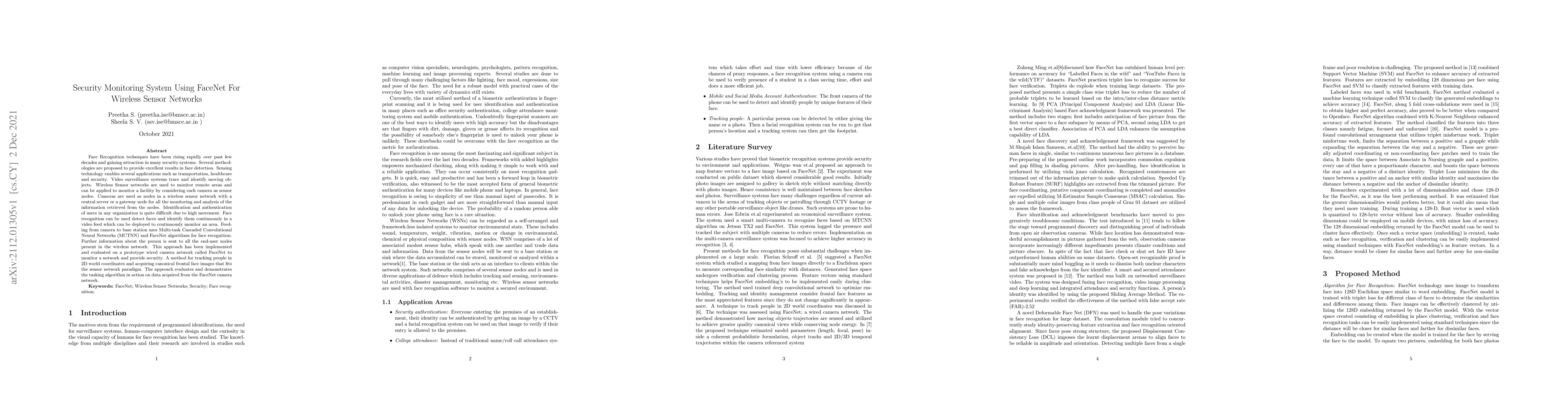 This paper proposes a security monitoring system using FaceNet for wireless sensor networks, where cameras act as sensor nodes and employ Multi-task Cascaded Convolutional Neural Networks (MCTCNN) and FaceNet for continuous face recognition and identification. The system demonstrates effective tracking and identification of individuals in monitored areas.