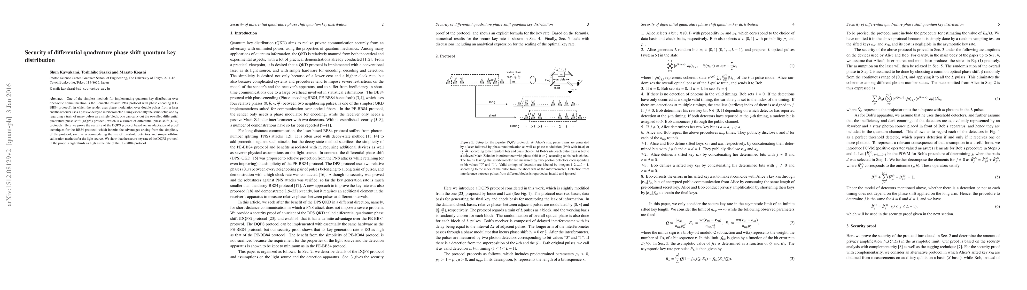 This paper proves the security of the differential quadrature phase shift (DQPS) quantum key distribution protocol, demonstrating its effectiveness through an adaptation of techniques used for the BB84 protocol. The DQPS protocol maintains simplicity while achieving a secure key rate that is eight-thirds that of the phase encoding BB84 protocol.