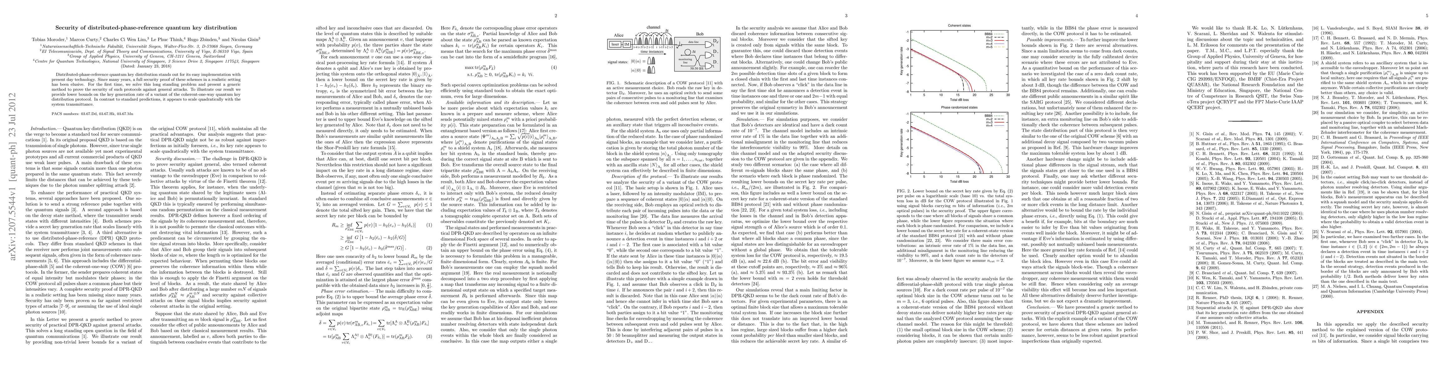 This paper presents a novel method to prove the security of distributed-phase-reference quantum key distribution protocols against general attacks, addressing a long-standing issue. It also demonstrates that a variant of the coherent-one-way protocol scales quadratically with system transmittance, contrary to standard predictions.