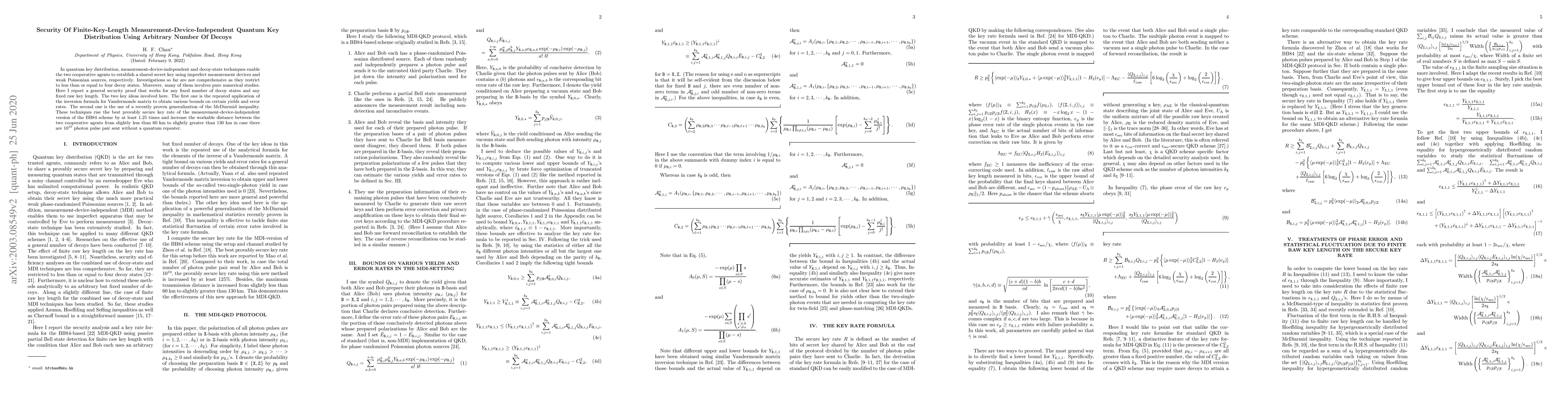 In quantum key distribution, measurement-device-independent and decoy-state techniques enable the two cooperative agents to establish a shared secret key using imperfect measurement devices and weak Poissonian sources, respectively. Investigations so far are not comprehensive as they restrict to less than or equal to four decoy states. Moreover, many of them involves pure numerical studies. Here I report a general security proof that works for any fixed number of decoy states and any fixed raw key length. The two key ideas involved here. The first one is the repeated application of the inversion formula for Vandermonde matrix to obtain various bounds on certain yields and error rates. The second one is the use of a recently proven generalization of the McDiarmid inequality. These techniques rise the best provably secure key rate of the measurement-device-independent version of the BB84 scheme by at least 1.25 times and increase the workable distance between the two cooperative agents from slightly less than 60 km to slightly greater than 130 km in case there are $10^{10}$ photon pulse pair sent without a quantum repeater.