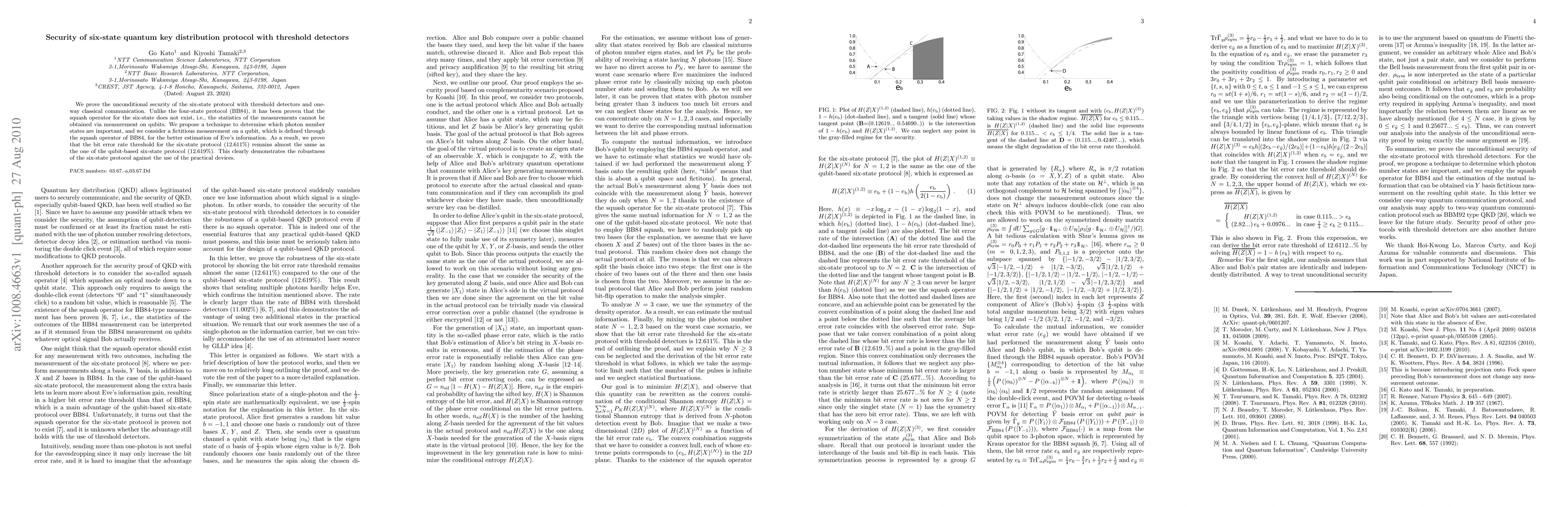 This paper proves the unconditional security of the six-state quantum key distribution protocol using threshold detectors, demonstrating that it does not suffer from the squash operator issue present in the four-state protocol. The study also establishes the bit error rate threshold, showing the protocol's robustness against practical device limitations.