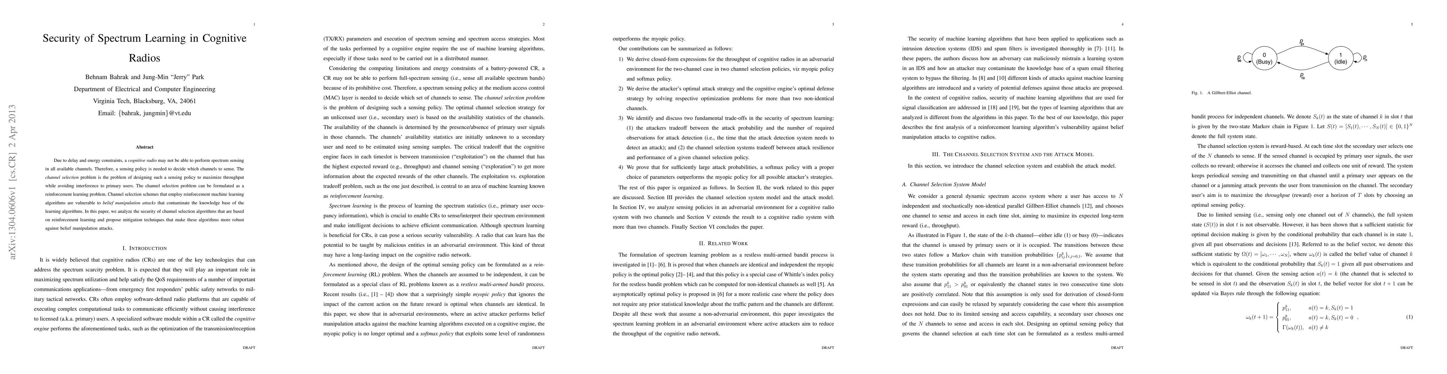 Researchers investigate the security of spectrum learning in cognitive radios, proposing mitigation techniques to prevent belief manipulation attacks in reinforcement learning-based channel selection algorithms.