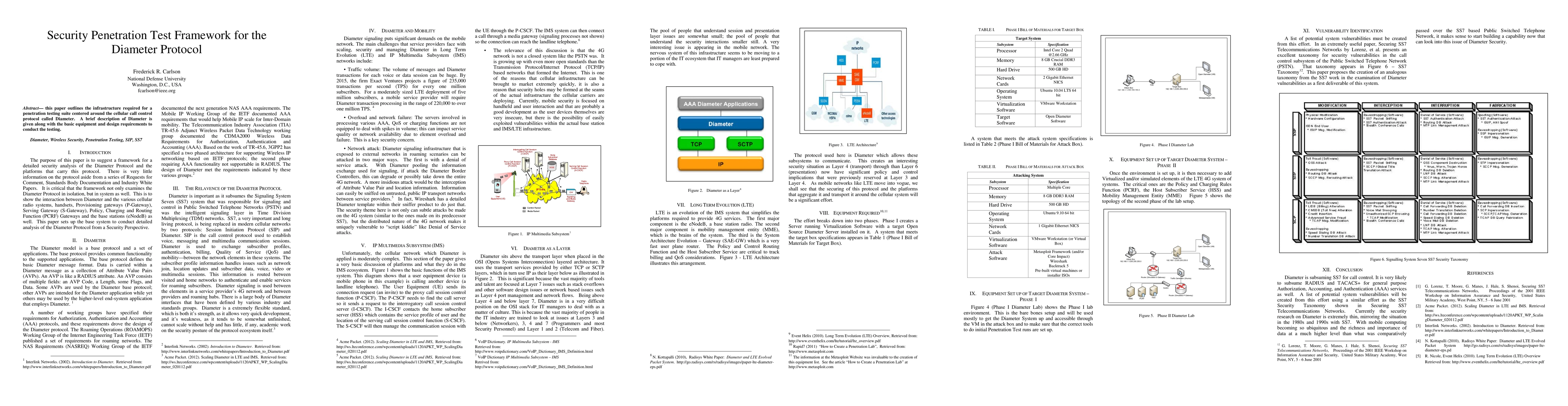 This paper outlines the infrastructure required for a penetration testing suite centered around the cellular call control protocol called Diameter. A brief description of Diameter is given along with the basic equipment and design requirements to conduct the testing.