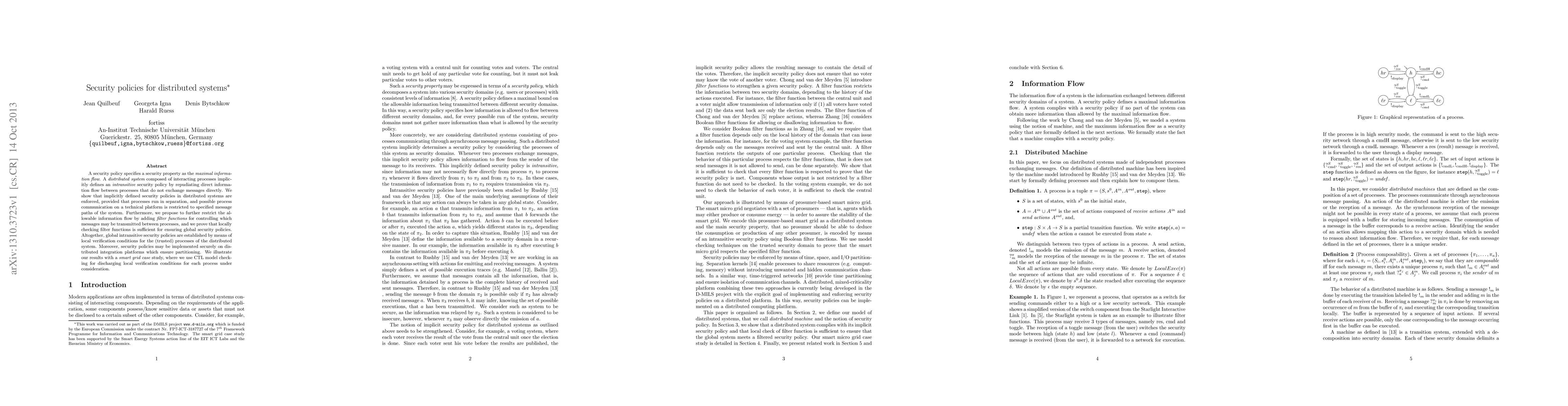 This paper discusses how security policies in distributed systems can be implicitly defined through the separation of processes and restricted communication paths. It proposes adding filter functions to control message transmission and proves that local verification is sufficient for enforcing global security policies, illustrated through a smart grid case study.