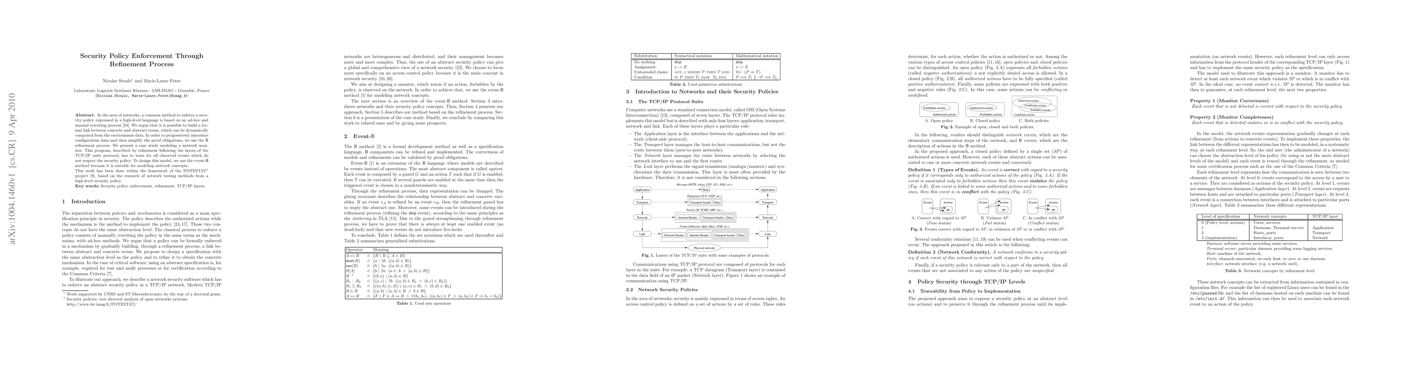 This paper proposes a method for enforcing security policies using the B refinement process, which dynamically links abstract and concrete terms derived from environment data. An event-B model of a network monitor is presented to demonstrate the approach, ensuring it warns for policy-violating events within the TCP/IP suite.