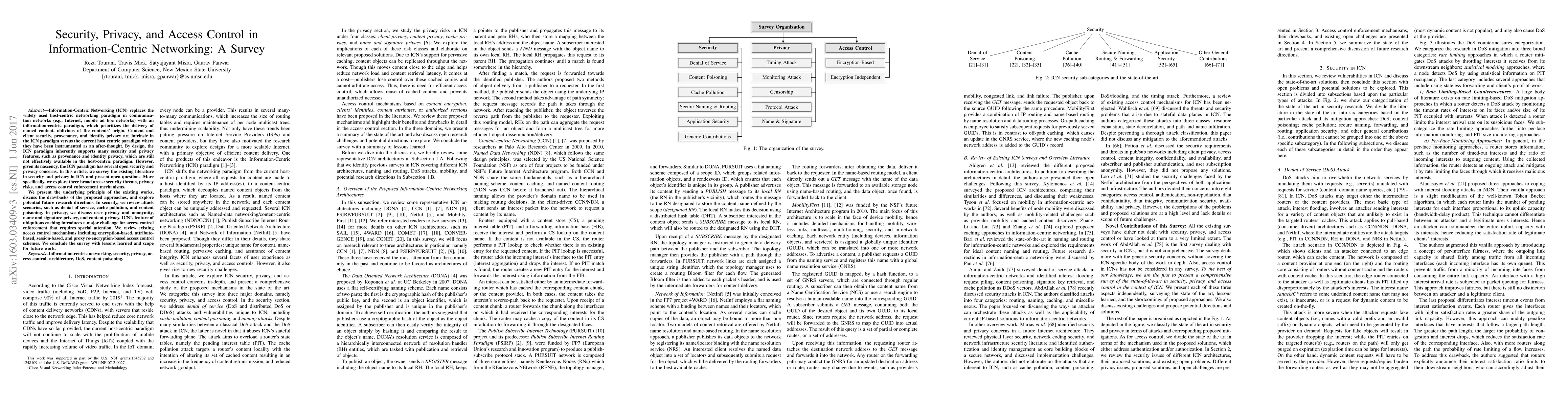 This paper surveys security, privacy, and access control in Information-Centric Networking (ICN), highlighting its inherent advantages over host-centric paradigms. It reviews existing threats, risks, and access control mechanisms, identifying open challenges and potential future research directions.
