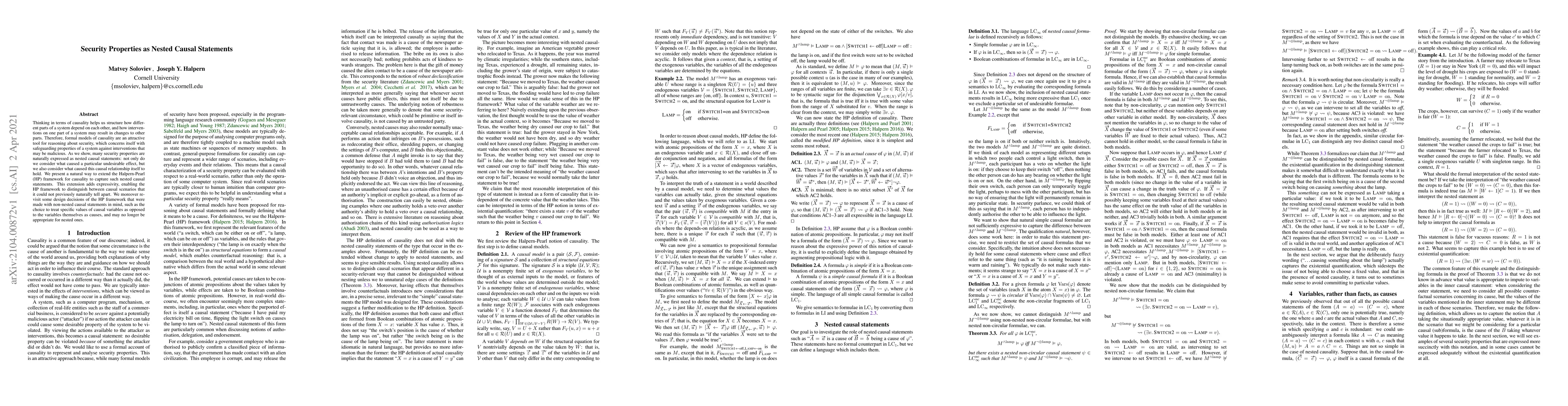 This paper explores how causality can be used to structure security properties in systems, proposing an extension of the Halpern-Pearl framework to handle nested causal statements that capture both direct and indirect causal relationships. The new model enhances the framework's ability to distinguish between different causal scenarios and revisits design decisions that may not be suitable for nested causal contexts.