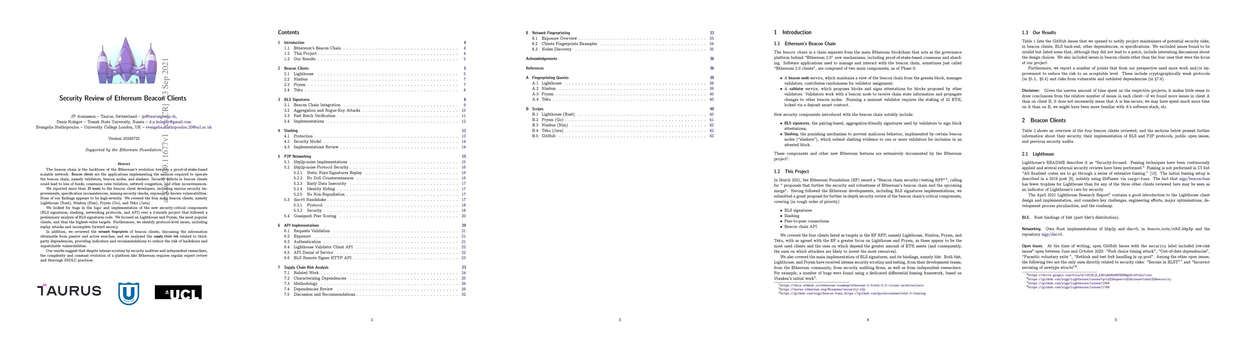 A security review of Ethereum beacon clients identified over 35 issues, including protocol-level vulnerabilities and missing security checks, highlighting the need for regular expert review and thorough software development life cycle practices.