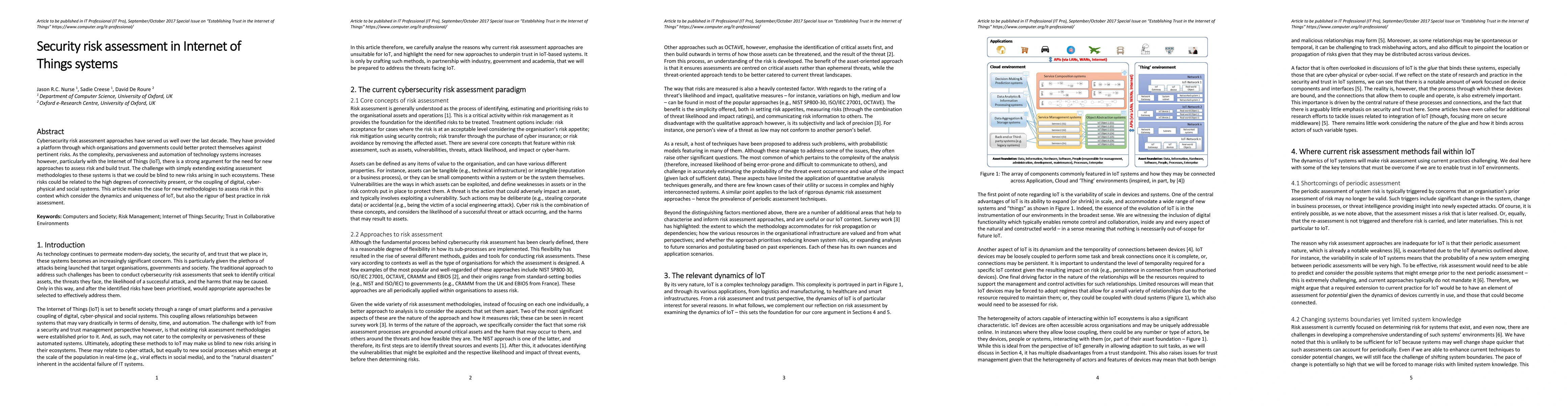 Information security risk assessment methods have served us well over the past two decades. They have provided a tool for organizations and governments to use in protecting themselves against pertinent risks. As the complexity, pervasiveness, and automation of technology systems increases and cyberspace matures, particularly with the Internet of Things (IoT), there is a strong argument that we will need new approaches to assess risk and build trust. The challenge with simply extending existing assessment methodologies to IoT systems is that we could be blind to new risks arising in such ecosystems. These risks could be related to the high degrees of connectivity present or the coupling of digital, cyber-physical, and social systems. This article makes the case for new methodologies to assess risk in this context that consider the dynamics and uniqueness of the IoT while maintaining the rigor of best practice in risk assessment.