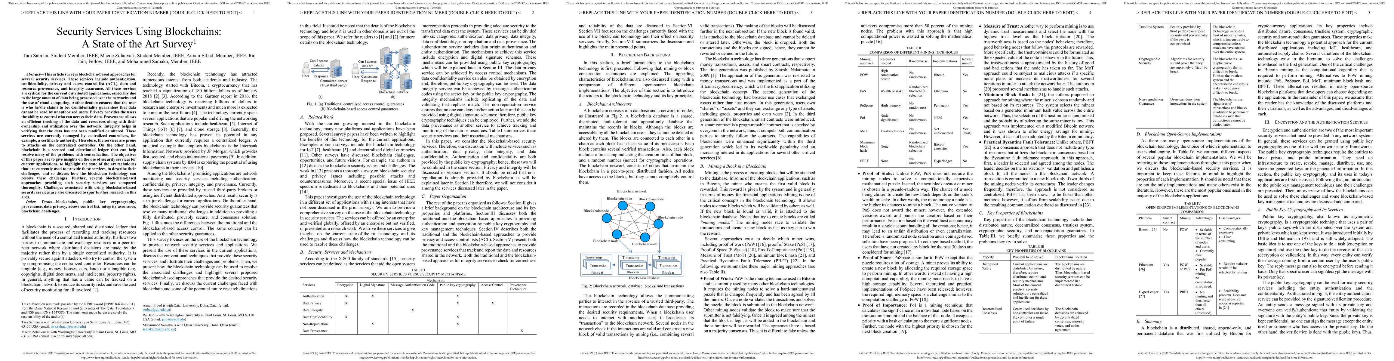 This article surveys blockchain-based approaches for several security services. These services include authentication, confidentiality, privacy, and access control list (ACL), data and resource provenance, and integrity assurance. All these services are critical for the current distributed applications, especially due to the large amount of data being processed over the networks and the use of cloud computing. Authentication ensures that the user is who he/she claims to be. Confidentiality guarantees that data cannot be read by unauthorized users. Privacy provides the users the ability to control who can access their data. Provenance allows an efficient tracking of the data and resources along with their ownership and utilization over the network. Integrity helps in verifying that the data has not been modified or altered. These services are currently managed by centralized controllers, for example, a certificate authority. Therefore, the services are prone to attacks on the centralized controller. On the other hand, blockchain is a secured and distributed ledger that can help resolve many of the problems with centralization. The objectives of this paper are to give insights on the use of security services for current applications, to highlight the state of the art techniques that are currently used to provide these services, to describe their challenges, and to discuss how the blockchain technology can resolve these challenges. Further, several blockchain-based approaches providing such security services are compared thoroughly. Challenges associated with using blockchain-based security services are also discussed to spur further research in this area.