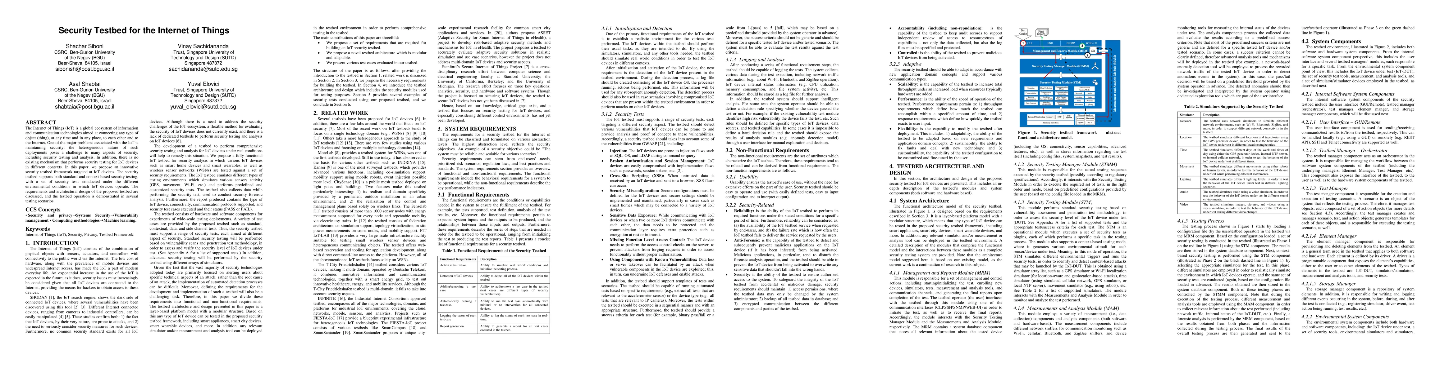 The Internet of Things (IoT) is a global ecosystem of information and communication technologies aimed at connecting any type of object (thing), at any time and in any place, to each other and to the Internet. One of the major problems associated with the IoT is maintaining security; the heterogeneous nature of such deployments poses a challenge to many aspects of security, including security testing and analysis. In addition, there is no existing mechanism that performs security testing for IoT devices in different contexts. In this paper, we propose an innovative security testbed framework targeted at IoT devices. The security testbed supports both standard and context-based security testing, with a set of security tests conducted under the different environmental conditions in which IoT devices operate. The requirements and architectural design of the proposed testbed are discussed, and the testbed operation is demonstrated in several testing scenarios.