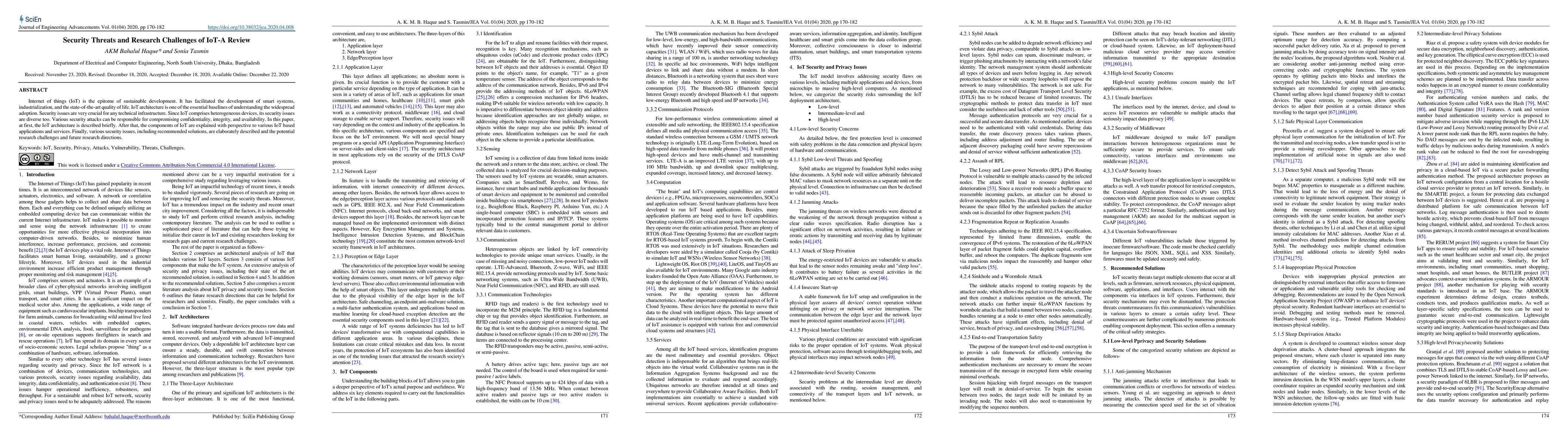Internet of things (IoT) is the epitome of sustainable development. It has facilitated the development of smart systems, industrialization, and the state-of-the-art quality of life. IoT architecture is one of the essential baselines of understanding the widespread adoption. Security issues are very crucial for any technical infrastructure. Since IoT comprises heterogeneous devices, its security issues are diverse too. Various security attacks can be responsible for compromising confidentiality, integrity, and availability. In this paper, at first, the IoT architecture is described briefly. After that, the components of IoT are explained with perspective to various IoT based applications and services. Finally, various security issues, including recommended solutions, are elaborately described and the potential research challenges and future research directions.