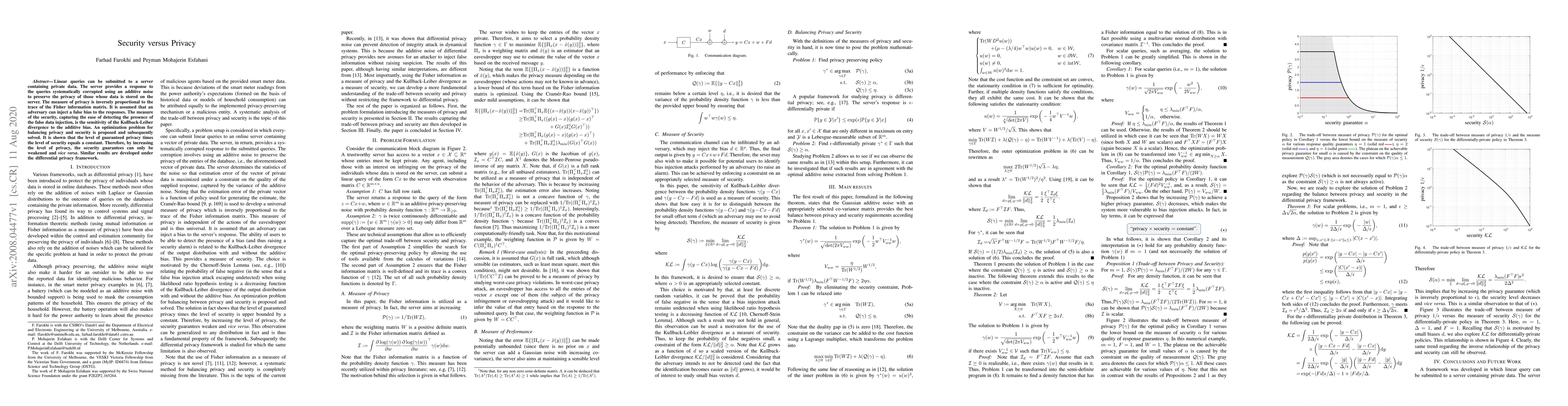 Linear queries can be submitted to a server containing private data. The server provides a response to the queries systematically corrupted using an additive noise to preserve the privacy of those whose data is stored on the server. The measure of privacy is inversely proportional to the trace of the Fisher information matrix. It is assumed that an adversary can inject a false bias to the responses. The measure of the security, capturing the ease of detecting the presence of the false data injection, is the sensitivity of the Kullback-Leiber divergence to the additive bias. An optimization problem for balancing privacy and security is proposed and subsequently solved. It is shown that the level of guaranteed privacy times the level of security equals a constant. Therefore, by increasing the level of privacy, the security guarantees can only be weakened and vice versa. Similar results are developed under the differential privacy framework.