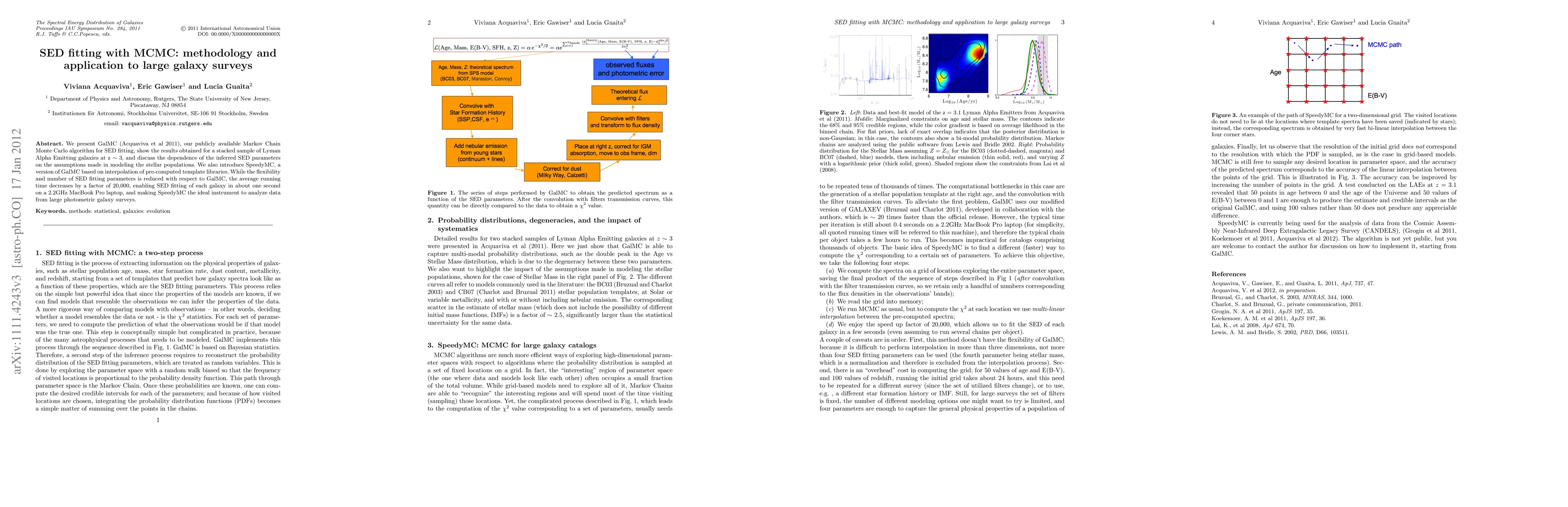 We present GalMC (Acquaviva et al 2011), our publicly available Markov Chain Monte Carlo algorithm for SED fitting, show the results obtained for a stacked sample of Lyman Alpha Emitting galaxies at z ~ 3, and discuss the dependence of the inferred SED parameters on the assumptions made in modeling the stellar populations. We also introduce SpeedyMC, a version of GalMC based on interpolation of pre-computed template libraries. While the flexibility and number of SED fitting parameters is reduced with respect to GalMC, the average running time decreases by a factor of 20,000, enabling SED fitting of each galaxy in about one second on a 2.2GHz MacBook Pro laptop, and making SpeedyMC the ideal instrument to analyze data from large photometric galaxy surveys.