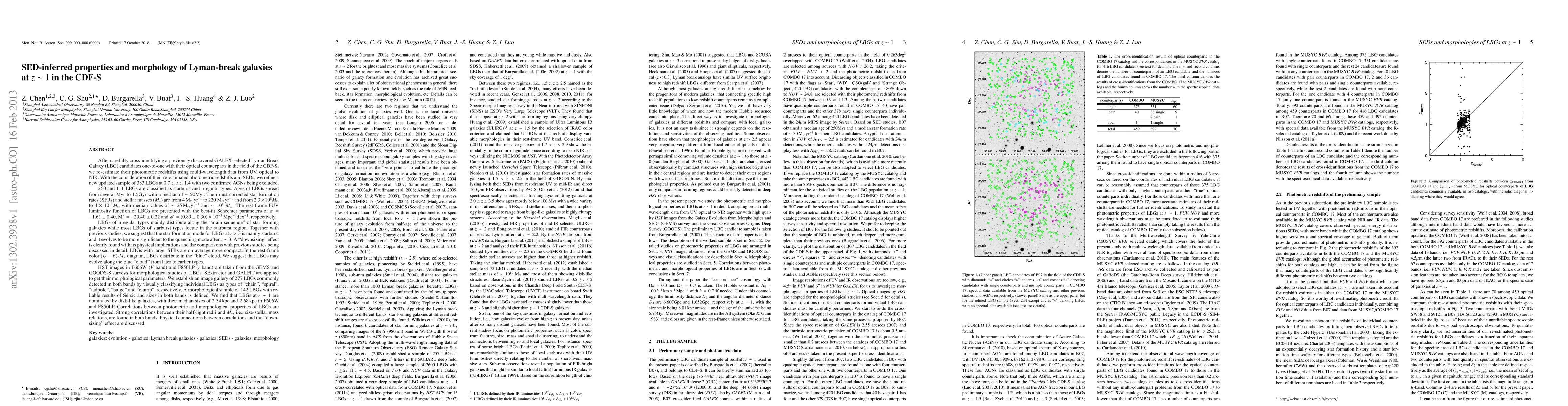 After carefully cross-identifying a previously discovered GALEX-selected Lyman Break Galaxy (LBG) candidates one-to-one with their optical counterparts in the field of the CDF-S, we re-estimate their photometric redshifts using multi-wavelength data from UV, optical to NIR. We refine a new updated sample of 383 LBGs at $0.7\la z \la 1.4$. Most LBGs are classified as starburst and irregular types. Ages spread from several Myr to 1.5Gyr. Their dust-corrected star formation rates (SFRs) and stellar masses ($M_*$) are from $4\my$ to $220\my$ and from $2.3\times 10^8 \msun$ to $4 \times 10^{11} \msun$. The rest-frame FUV luminosity function of LBGs are presented. LBGs of irregular types mainly distribute along the "main sequence" of star forming galaxies while most LBGs of starburst types locate in the starburst region. A "downsizing" effect is clearly found and LBGs distribute in the "blue" cloud. HST images in F606W ($V$ band) and F850LP ($z$ band) are taken from the GEMS and GOODS-S surveys. SExtractor and GALFIT are applied to get their morphological parameters. A morphological sample of 142 LBGs with reliable results of $\sersic$ and sizes in both bands is defined. We find that LBGs at $z\sim 1 $ are dominated by disk-like galaxies. Correlations between photometric and morphological properties of LBGs are investigated. Strong correlations between their half-light radii and $M_*$, i.e., size-stellar mass relations, are found in both bands. Physical connections between correlations and the "downsizing" effect are discussed.