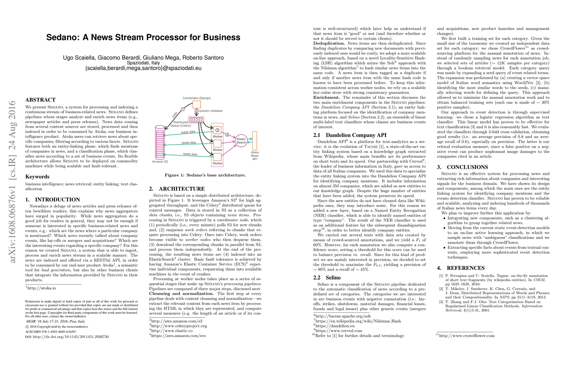 We present Sedano, a system for processing and indexing a continuous stream of business-related news. Sedano defines pipelines whose stages analyze and enrich news items (e.g., newspaper articles and press releases). News data coming from several content sources are stored, processed and then indexed in order to be consumed by Atoka, our business intelligence product. Atoka users can retrieve news about specific companies, filtering according to various facets. Sedano features both an entity-linking phase, which finds mentions of companies in news, and a classification phase, which classifies news according to a set of business events. Its flexible architecture allows Sedano to be deployed on commodity machines while being scalable and fault-tolerant.