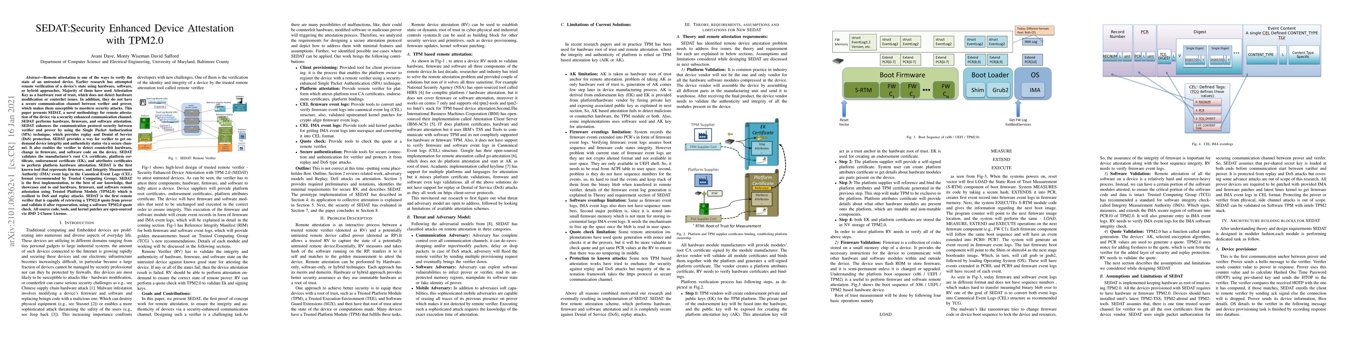 SEDAT enhances remote attestation using TPM2.0 by integrating hardware, firmware, and software verification, employing secure SPA communication to protect against replay and DoS attacks, and presenting the first end-to-end attestation method resilient to such attacks.