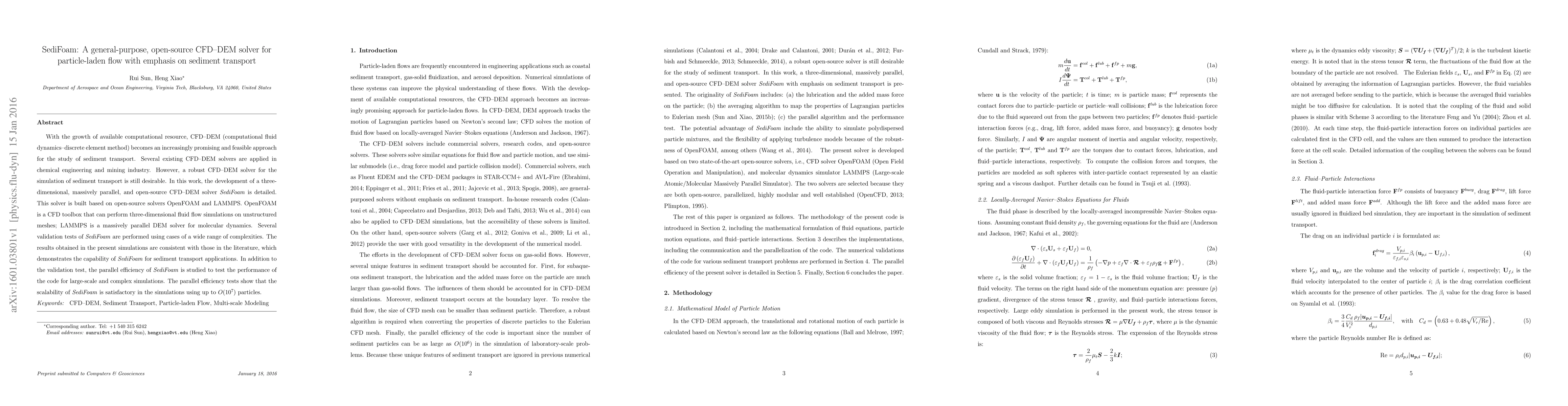 SediFoam is a new, open-source CFD-DEM solver developed for simulating particle-laden flows, particularly sediment transport, leveraging the capabilities of OpenFOAM and LAMMPS. The solver demonstrates robust performance and scalability, validated through complex sediment transport simulations and parallel efficiency tests.