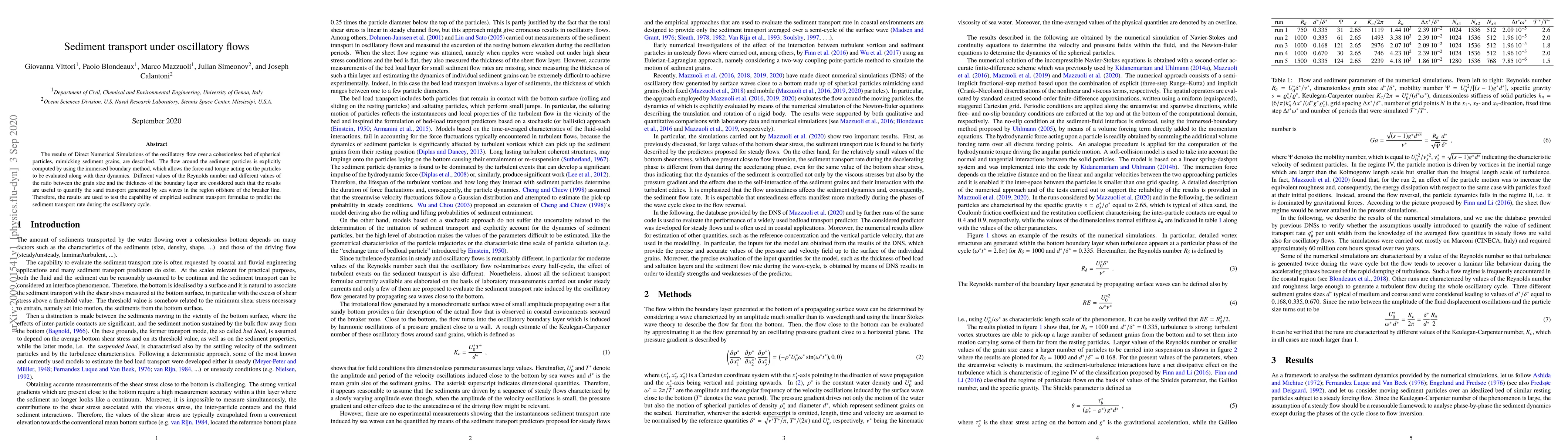 This paper uses Direct Numerical Simulations to study sediment transport under oscillatory flows over a bed of spherical particles, employing the immersed boundary method to compute forces and particle dynamics. The findings are applied to evaluate the accuracy of empirical sediment transport formulae in predicting sand transport rates offshore.