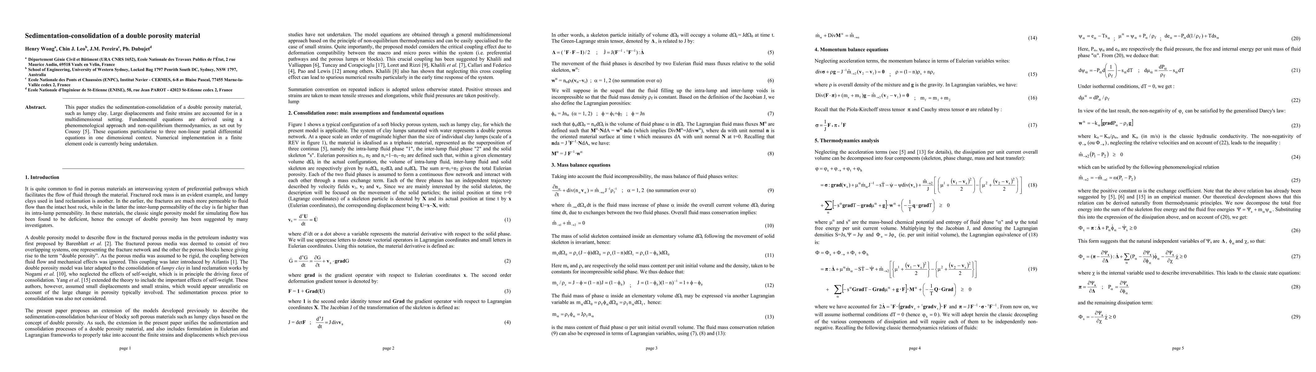 This paper studies the sedimentation-consolidation of a double porosity material, such as lumpy clay. Large displacements and finite strains are accounted for in a multidimensional setting. Fundamental equations are derived using a phenomenological approach and non-equilibrium thermodynamics, as set out by Coussy [Coussy, Poromechanics, Wiley, Chichester, 2004]. These equations particularise to three non-linear partial differential equations in one dimensional context. Numerical implementation in a finite element code is currently being undertaken.