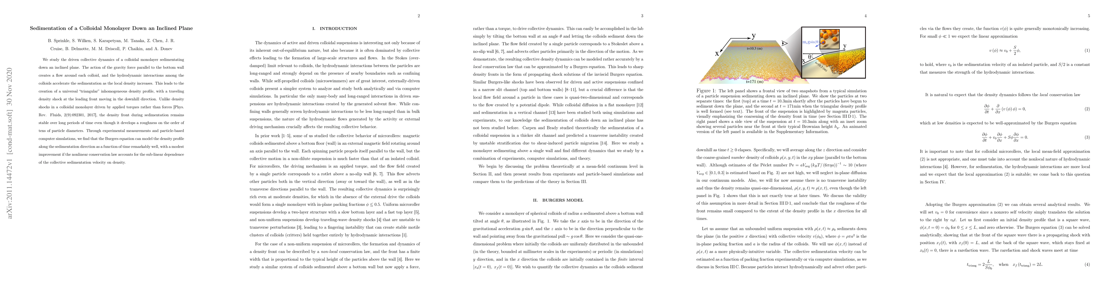 The study examines the sedimentation of a colloidal monolayer down an inclined plane using both experimental measurements and particle-based computer simulations. It focuses on the driven collective dynamics, hydrodynamic interactions, and the formation of a universal triangular density profile with a stable traveling density shock.