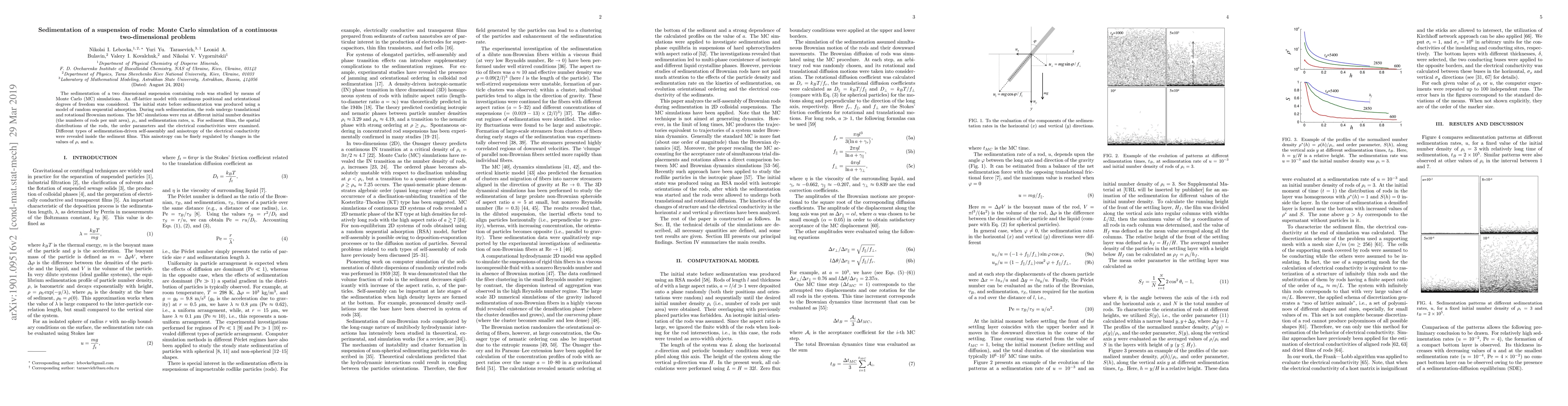 This paper uses kinetic Monte Carlo simulations to study the sedimentation of a two-dimensional suspension of rods, revealing self-assembly and anisotropy in sediment films that can be controlled by varying initial density and sedimentation rates. The simulations explore the spatial distributions, order parameters, and electrical conductivities of the sediment.