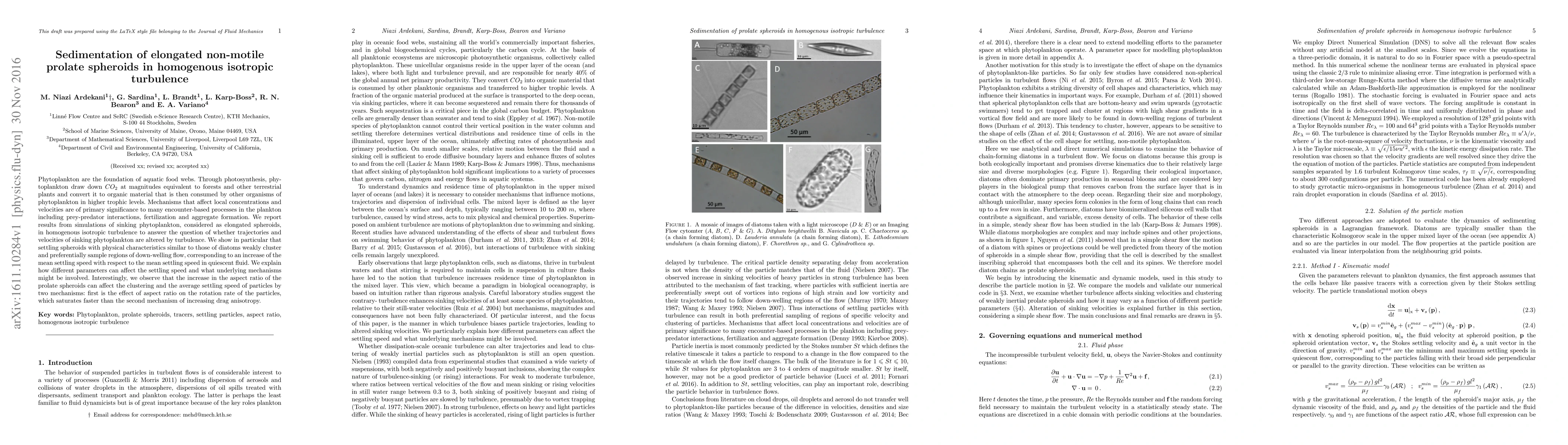 This study investigates the sedimentation behavior of elongated phytoplankton (diatoms) in turbulent water, finding that turbulence enhances their settling speed by causing weak clustering and preferential sampling of down-welling flows. The aspect ratio of the spheroids influences both clustering and settling speed through changes in rotation rates and drag anisotropy.