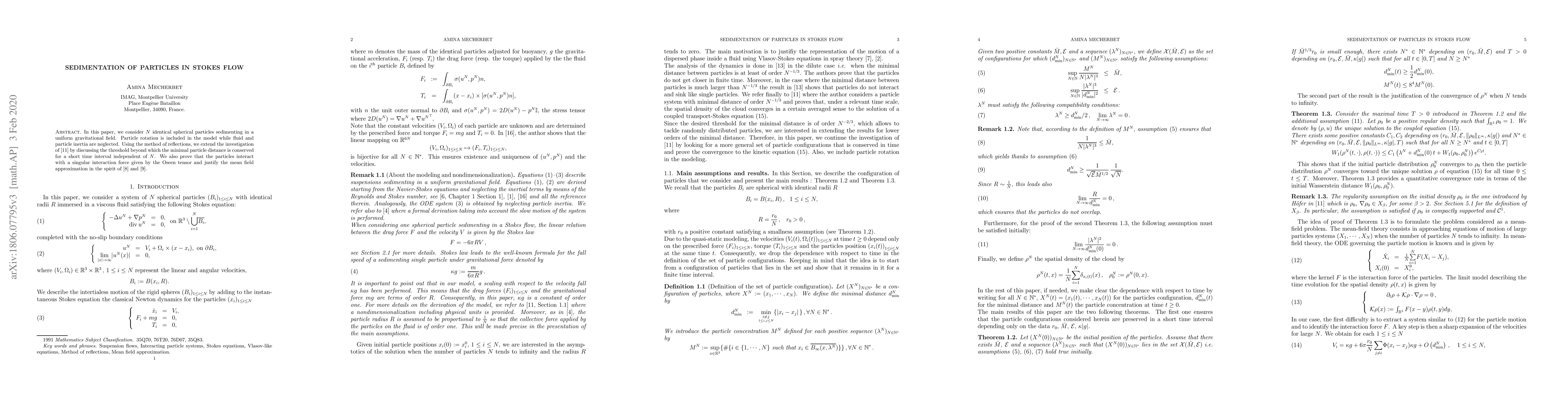 This paper studies how particles move in a fluid when gravity pulls them down, considering rotation and no inertia. It finds the optimal distance between particles that remains constant over time and justifies an approximation of complex equations for simpler models.
