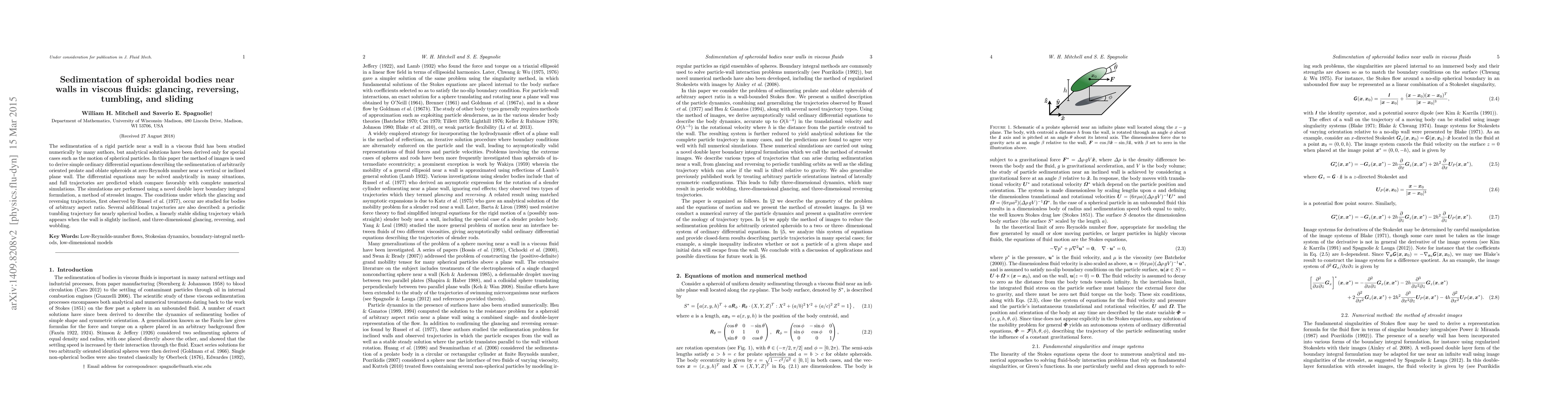 This paper uses the method of images to derive analytical equations for sedimentation of arbitrarily shaped spheroidal particles near walls in viscous fluids. Numerical simulations with a boundary integral formulation support these findings, revealing various trajectories like glancing, reversing, tumbling, and sliding, providing insights into particle behavior in such systems.