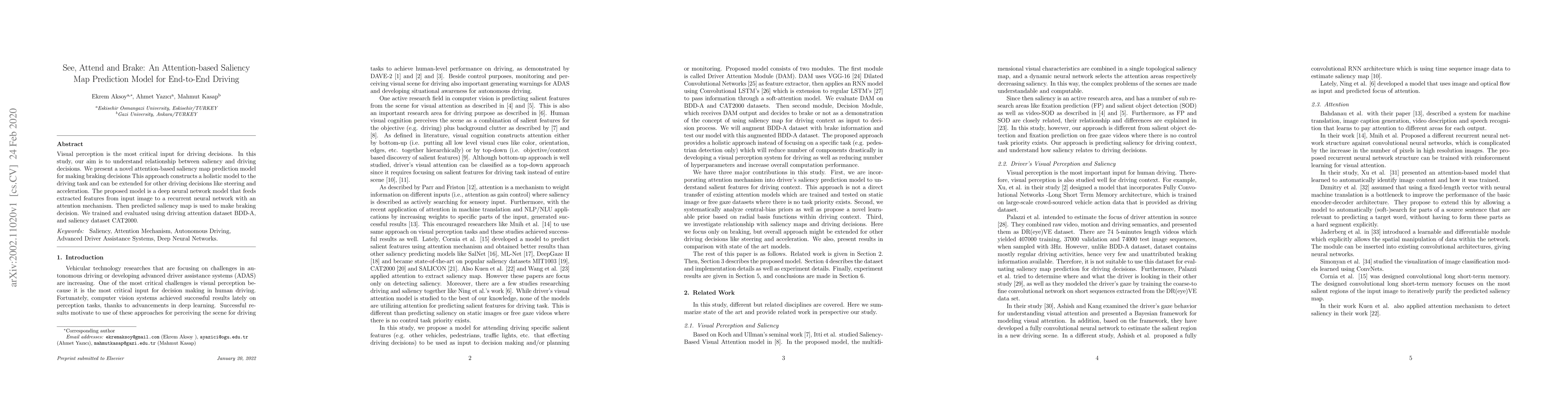 Visual perception is the most critical input for driving decisions. In this study, our aim is to understand relationship between saliency and driving decisions. We present a novel attention-based saliency map prediction model for making braking decisions This approach constructs a holistic model to the driving task and can be extended for other driving decisions like steering and acceleration. The proposed model is a deep neural network model that feeds extracted features from input image to a recurrent neural network with an attention mechanism. Then predicted saliency map is used to make braking decision. We trained and evaluated using driving attention dataset BDD-A, and saliency dataset CAT2000.