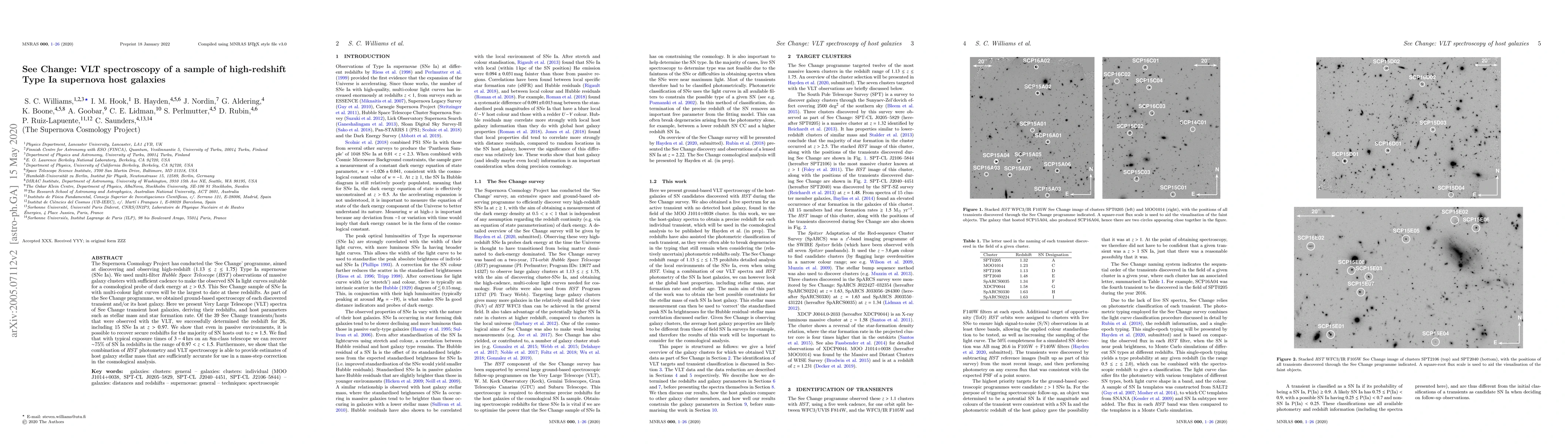 The 'See Change' program used HST and VLT to observe high-redshift Type Ia supernovae (SNe Ia) for dark energy studies. They successfully determined redshifts for 26 out of 39 transient hosts, including 15 SNe Ia at z > 0.97. With 3-4 hr VLT exposures, they achieved ~75% SN Ia redshift success in the 0.97 < z < 1.5 range. Combining HST photometry and VLT spectroscopy allowed accurate host galaxy stellar mass estimation for cosmological analysis correction.