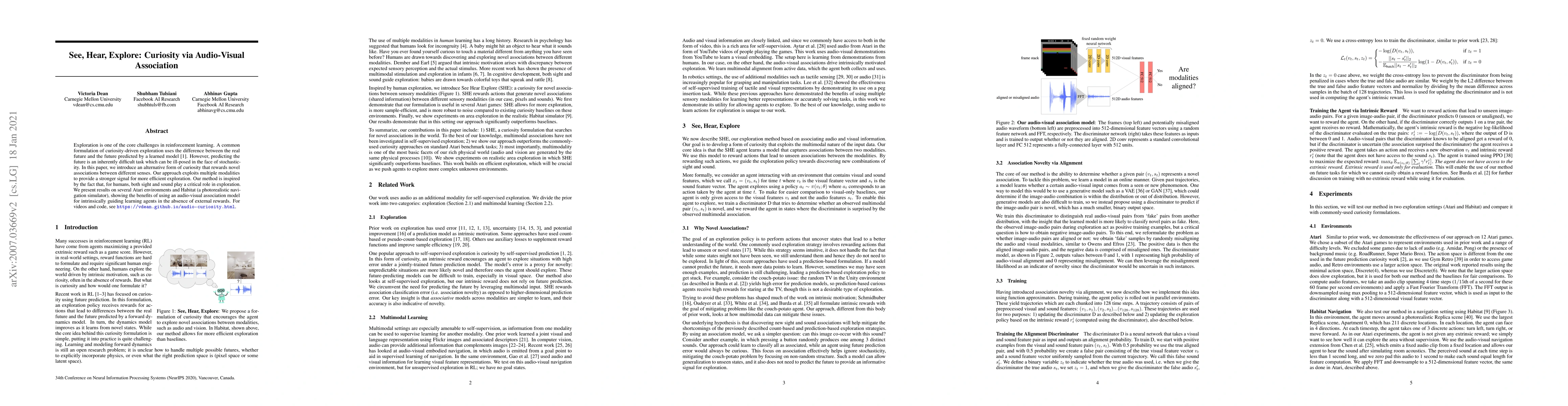 Exploration is one of the core challenges in reinforcement learning. A common formulation of curiosity-driven exploration uses the difference between the real future and the future predicted by a learned model. However, predicting the future is an inherently difficult task which can be ill-posed in the face of stochasticity. In this paper, we introduce an alternative form of curiosity that rewards novel associations between different senses. Our approach exploits multiple modalities to provide a stronger signal for more efficient exploration. Our method is inspired by the fact that, for humans, both sight and sound play a critical role in exploration. We present results on several Atari environments and Habitat (a photorealistic navigation simulator), showing the benefits of using an audio-visual association model for intrinsically guiding learning agents in the absence of external rewards. For videos and code, see https://vdean.github.io/audio-curiosity.html.