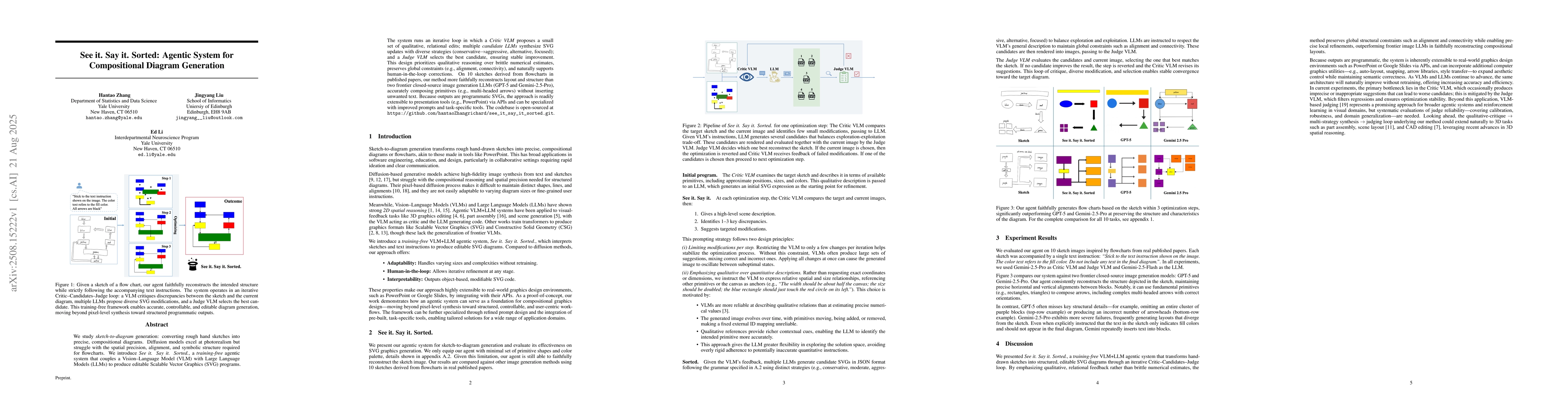 We study sketch-to-diagram generation: converting rough hand sketches into precise, compositional diagrams. Diffusion models excel at photorealism but struggle with the spatial precision, alignment, and symbolic structure required for flowcharts. We introduce See it. Say it. Sorted., a training-free agentic system that couples a Vision-Language Model (VLM) with Large Language Models (LLMs) to produce editable Scalable Vector Graphics (SVG) programs. The system runs an iterative loop in which a Critic VLM proposes a small set of qualitative, relational edits; multiple candidate LLMs synthesize SVG updates with diverse strategies (conservative->aggressive, alternative, focused); and a Judge VLM selects the best candidate, ensuring stable improvement. This design prioritizes qualitative reasoning over brittle numerical estimates, preserves global constraints (e.g., alignment, connectivity), and naturally supports human-in-the-loop corrections. On 10 sketches derived from flowcharts in published papers, our method more faithfully reconstructs layout and structure than two frontier closed-source image generation LLMs (GPT-5 and Gemini-2.5-Pro), accurately composing primitives (e.g., multi-headed arrows) without inserting unwanted text. Because outputs are programmatic SVGs, the approach is readily extensible to presentation tools (e.g., PowerPoint) via APIs and can be specialized with improved prompts and task-specific tools. The codebase is open-sourced at https://github.com/hantaoZhangrichard/see_it_say_it_sorted.git.