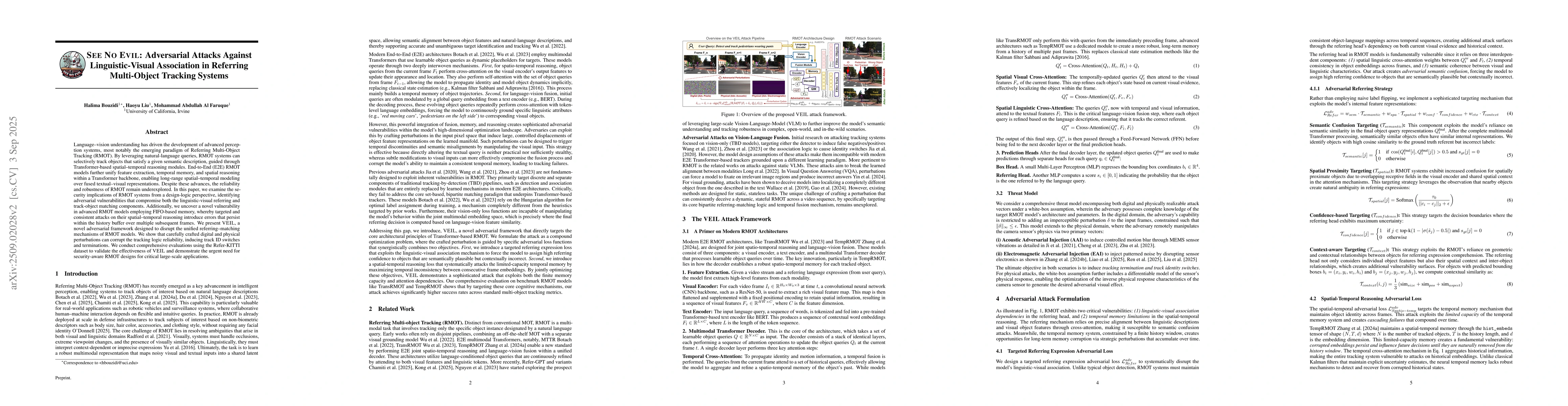 Language-vision understanding has driven the development of advanced perception systems, most notably the emerging paradigm of Referring Multi-Object Tracking (RMOT). By leveraging natural-language queries, RMOT systems can selectively track objects that satisfy a given semantic description, guided through Transformer-based spatial-temporal reasoning modules. End-to-End (E2E) RMOT models further unify feature extraction, temporal memory, and spatial reasoning within a Transformer backbone, enabling long-range spatial-temporal modeling over fused textual-visual representations. Despite these advances, the reliability and robustness of RMOT remain underexplored. In this paper, we examine the security implications of RMOT systems from a design-logic perspective, identifying adversarial vulnerabilities that compromise both the linguistic-visual referring and track-object matching components. Additionally, we uncover a novel vulnerability in advanced RMOT models employing FIFO-based memory, whereby targeted and consistent attacks on their spatial-temporal reasoning introduce errors that persist within the history buffer over multiple subsequent frames. We present VEIL, a novel adversarial framework designed to disrupt the unified referring-matching mechanisms of RMOT models. We show that carefully crafted digital and physical perturbations can corrupt the tracking logic reliability, inducing track ID switches and terminations. We conduct comprehensive evaluations using the Refer-KITTI dataset to validate the effectiveness of VEIL and demonstrate the urgent need for security-aware RMOT designs for critical large-scale applications.