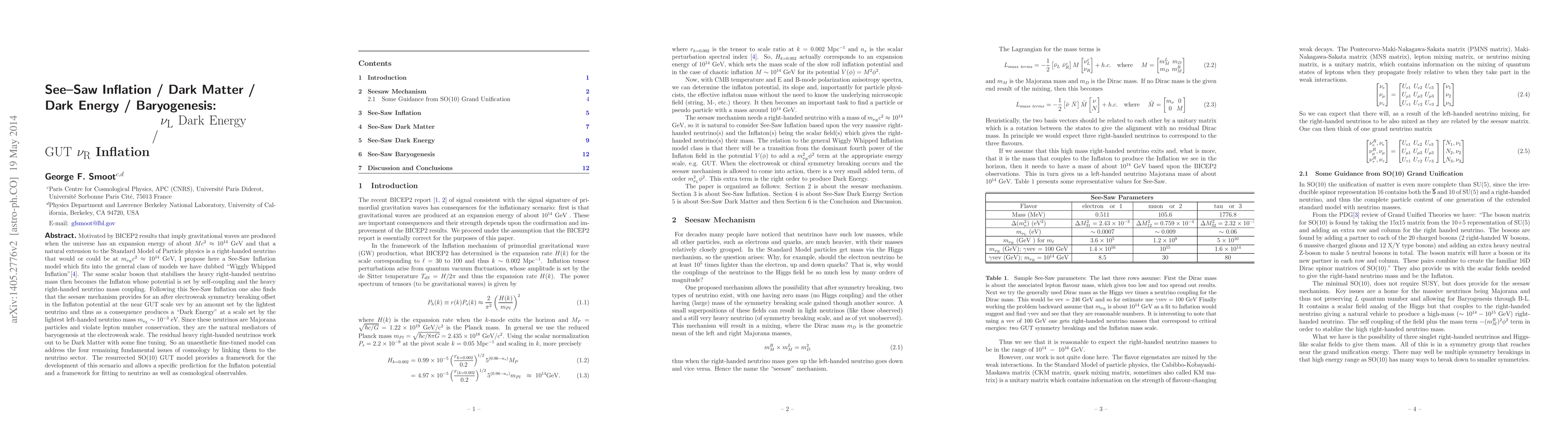 Motivated by BICEP2 results that imply gravitational waves are produced when the universe has an expansion energy of about $Mc^2 \approx 10^{14}$ GeV and that a natural extension to the Standard Model of Particle physics is a right-handed neutrino that would or could be at $m_{\nu_R}c^2 \approx 10^{14}$ GeV, I propose here a See-Saw Inflation model which fits into the general class of models we have dubbed "Wiggly Whipped Inflation"\cite{Hazra:2014WWI}. The residual heavy right-handed neutrinos work out to be Dark Matter in reasonable physical scenarios. The same scalar boson that stabilises the heavy right-handed neutrino mass then becomes the Inflaton whose potential is set by self-coupling and the heavy right-handed neutrino mass coupling. Following this See-Saw Inflation one also finds that the seesaw mechanism provides for an after electroweak symmetry breaking offset in the Inflaton potential at the near GUT scale vev by an amount set by the lightest neutrino and thus as a consequence produces a "Dark Energy" at a scale set by the lightest left-handed neutrino mass $m_{\nu_L} \sim 10^{-3}$ eV. Since these neutrinos are Majorana particles and violate lepton number conservation, they are the natural mediators of baryogenesis at the electroweak scale. The residual heavy right-handed neutrinos work out to be Dark Matter with some fine tuning. So an unaesthetic fine-tuned model can address the four remaining fundamental issues of cosmology by linking them to the neutrino sector. The resurrected SO(10) GUT model provides a framework for the development of this scenario and allows a specific prediction for the Inflaton potential and a framework for fitting to neutrino as well as cosmological observables.