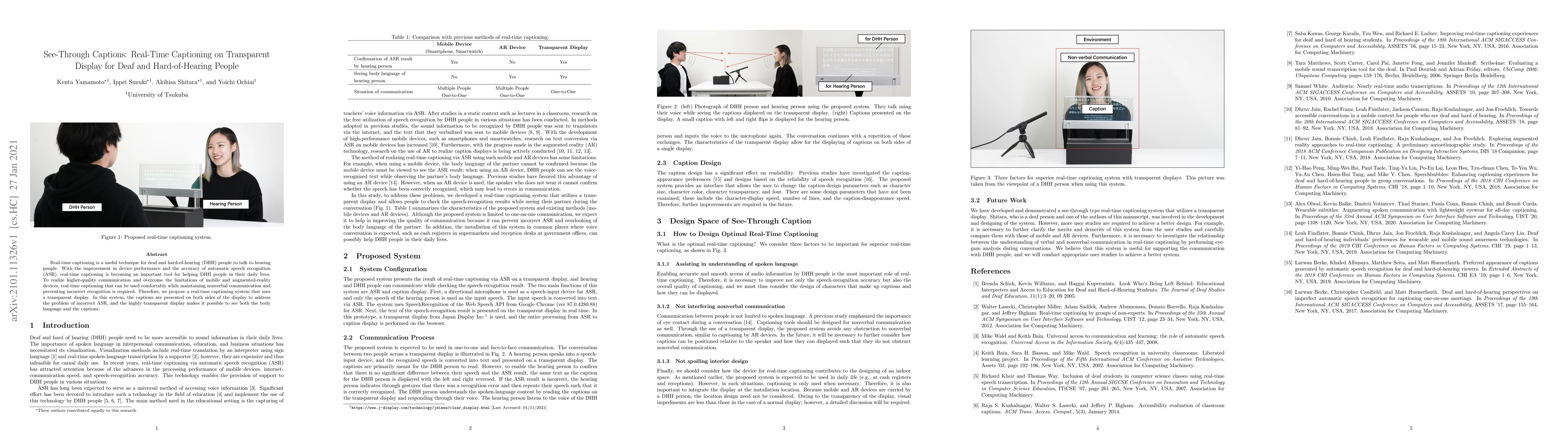 The research proposes a real-time captioning system using a transparent display for deaf and hard-of-hearing (DHH) people, which allows checking ASR results while maintaining nonverbal communication and preventing incorrect recognition.