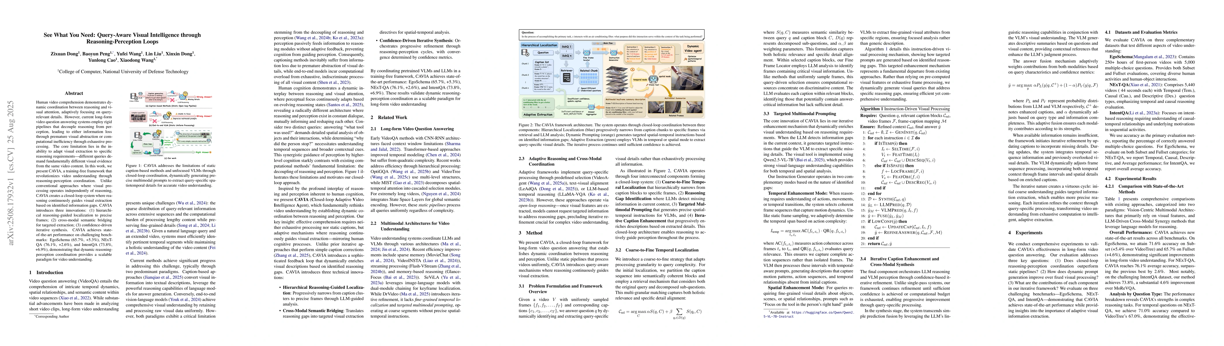 Human video comprehension demonstrates dynamic coordination between reasoning and visual attention, adaptively focusing on query-relevant details. However, current long-form video question answering systems employ rigid pipelines that decouple reasoning from perception, leading to either information loss through premature visual abstraction or computational inefficiency through exhaustive processing. The core limitation lies in the inability to adapt visual extraction to specific reasoning requirements, different queries demand fundamentally different visual evidence from the same video content. In this work, we present CAVIA, a training-free framework that revolutionizes video understanding through reasoning, perception coordination. Unlike conventional approaches where visual processing operates independently of reasoning, CAVIA creates a closed-loop system where reasoning continuously guides visual extraction based on identified information gaps. CAVIA introduces three innovations: (1) hierarchical reasoning, guided localization to precise frames; (2) cross-modal semantic bridging for targeted extraction; (3) confidence-driven iterative synthesis. CAVIA achieves state-of-the-art performance on challenging benchmarks: EgoSchema (65.7%, +5.3%), NExT-QA (76.1%, +2.6%), and IntentQA (73.8%, +6.9%), demonstrating that dynamic reasoning-perception coordination provides a scalable paradigm for video understanding.