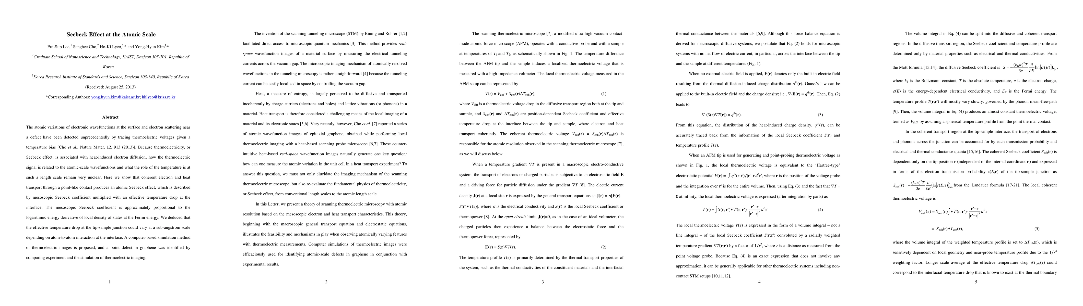 The atomic variations of electronic wavefunctions at the surface and electron scattering near a defect have been detected unprecedentedly by tracing thermoelectric voltages given a temperature bias [Cho et al., Nature Mater. 12, 913 (2013)]. Because thermoelectricity, or Seebeck effect, is associated with heat-induced electron diffusion, how the thermoelectric signal is related to the atomic-scale wavefunctions and what the role of the temperature is at such a length scale remain very unclear. Here we show that coherent electron and heat transport through a point-like contact produces an atomic Seebeck effect, which is described by mesoscopic Seebeck coefficient multiplied with an effective temperature drop at the interface. The mesoscopic Seebeck coefficient is approximately proportional to the logarithmic energy derivative of local density of states at the Fermi energy. We deduced that the effective temperature drop at the tip-sample junction could vary at a sub-angstrom scale depending on atom-to-atom interaction at the interface. A computer-based simulation method of thermoelectric images is proposed, and a point defect in graphene was identified by comparing experiment and the simulation of thermoelectric imaging.