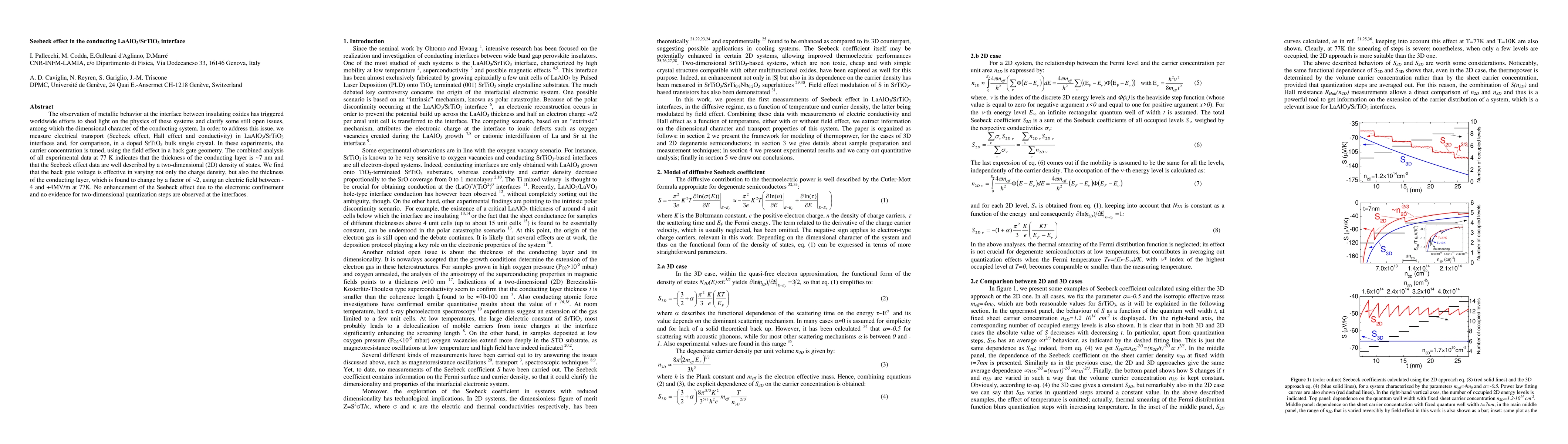 The observation of metallic behavior at the interface between insulating oxides has triggered worldwide efforts to shed light on the physics of these systems and clarify some still open issues, among which the dimensional character of the conducting system. In order to address this issue, we measure electrical transport (Seebeck effect, Hall effect and conductivity) in LaAlO_{3}/SrTiO_{3} interfaces and, for comparison, in a doped SrTiO_{3} bulk single crystal. In these experiments, the carrier concentration is tuned, using the field effect in a back gate geometry. The combined analysis of all experimental data at 77 K indicates that the thickness of the conducting layer is ~7 nm and that the Seebeck effect data are well described by a two-dimensional (2D) density of states. We find that the back gate voltage is effective in varying not only the charge density, but also the thickness of the conducting layer, which is found to change by a factor of ~2, using an electric field between -4 and +4MV/m at 77K. No enhancement of the Seebeck effect due to the electronic confinement and no evidence for two-dimensional quantization steps are observed at the interfaces.