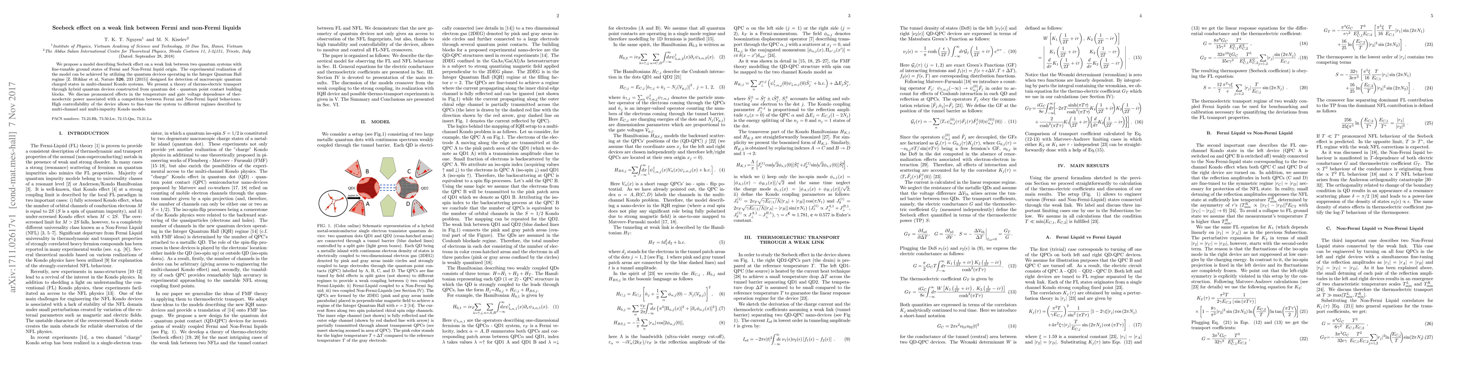 We propose a model describing Seebeck effect on a weak link between two quantum systems with fine-tunable ground states of Fermi and Non-Fermi liquid origin. The experimental realization of the model can be achieved by utilizing the quantum devices operating in the Integer Quantum Hall regime [Z. Iftikhar et al, Nature 526, 233 (2015)] designed for detection of macroscopic quantum charged states in multi-channel Kondo systems. We present a theory of thermo-electric transport through hybrid quantum devices constructed from quantum dot - quantum point contact building blocks. We discuss pronounced effects in the temperature and gate voltage dependence of thermoelectric power associated with a competition between Fermi and Non-Fermi liquid behaviors. High controllability of the device allows to fine-tune the system to different regimes described by multi-channel and multi-impurity Kondo models.