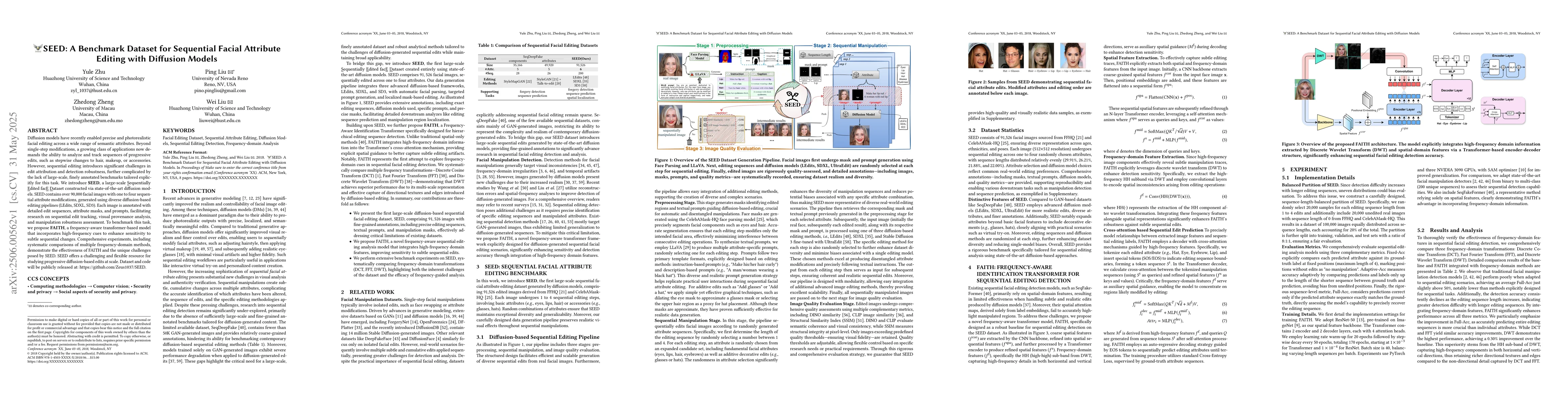 The paper introduces SEED, a large-scale sequential facial attribute editing dataset generated using advanced diffusion models. It also proposes FAITH, a frequency-aware transformer model for sequential editing detection, leveraging high-frequency features to enhance sensitivity to subtle changes.