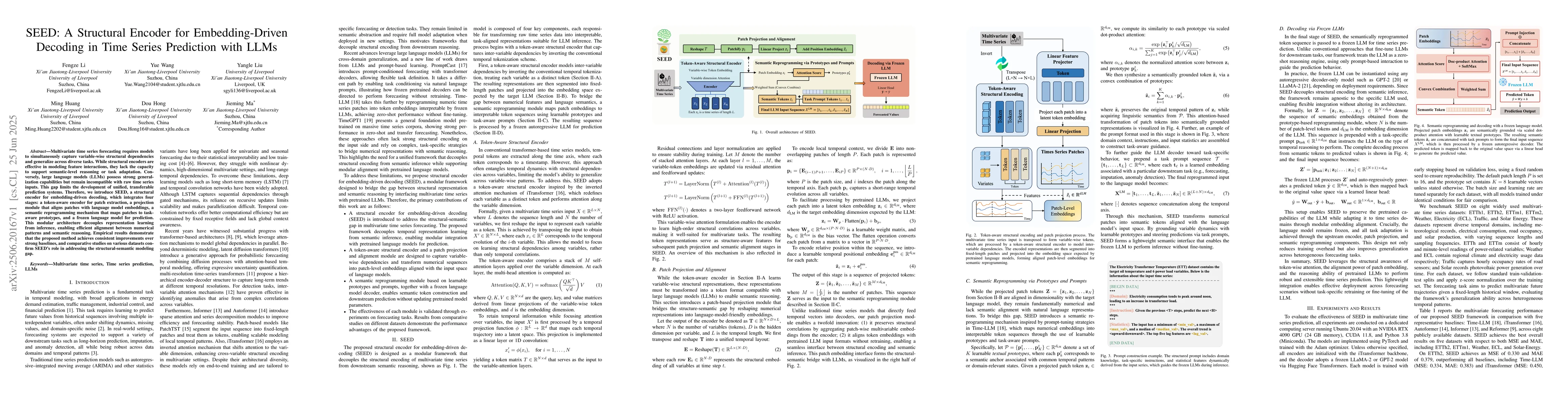 Multivariate time series forecasting requires models to simultaneously capture variable-wise structural dependencies and generalize across diverse tasks. While structural encoders are effective in modeling feature interactions, they lack the capacity to support semantic-level reasoning or task adaptation. Conversely, large language models (LLMs) possess strong generalization capabilities but remain incompatible with raw time series inputs. This gap limits the development of unified, transferable prediction systems. Therefore, we introduce SEED, a structural encoder for embedding-driven decoding, which integrates four stages: a token-aware encoder for patch extraction, a projection module that aligns patches with language model embeddings, a semantic reprogramming mechanism that maps patches to task-aware prototypes, and a frozen language model for prediction. This modular architecture decouples representation learning from inference, enabling efficient alignment between numerical patterns and semantic reasoning. Empirical results demonstrate that the proposed method achieves consistent improvements over strong baselines, and comparative studies on various datasets confirm SEED's role in addressing the structural-semantic modeling gap.