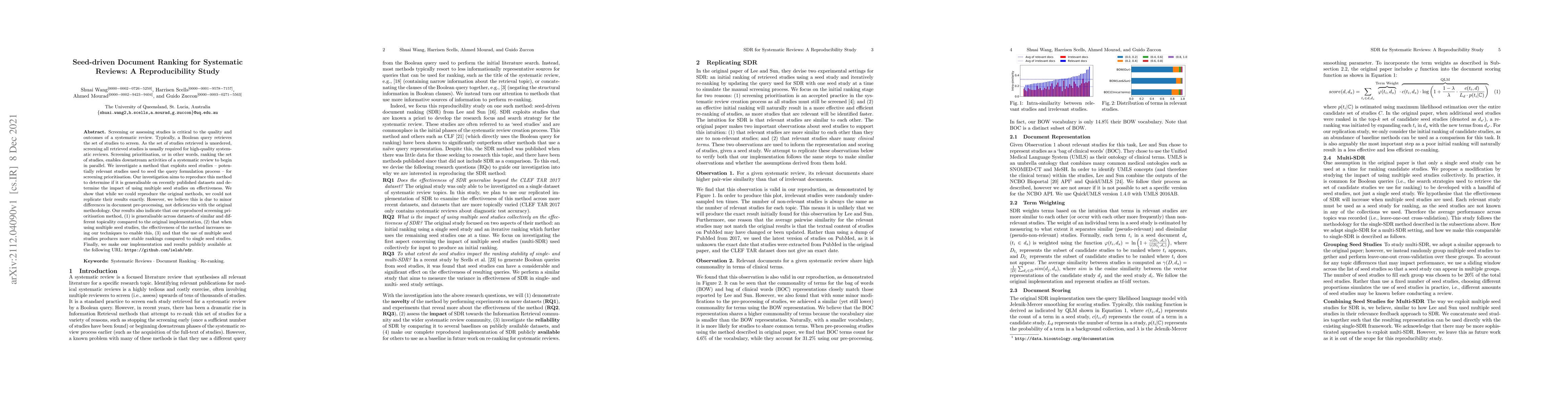 This study investigates a method for prioritizing study screening in systematic reviews using seed studies to inform query formulation. The authors successfully reproduced the original method but found differences in results, attributing them to variations in document pre-processing. The reproduced method showed generalizability across different datasets and improved effectiveness with multiple seed studies, leading to more stable rankings.