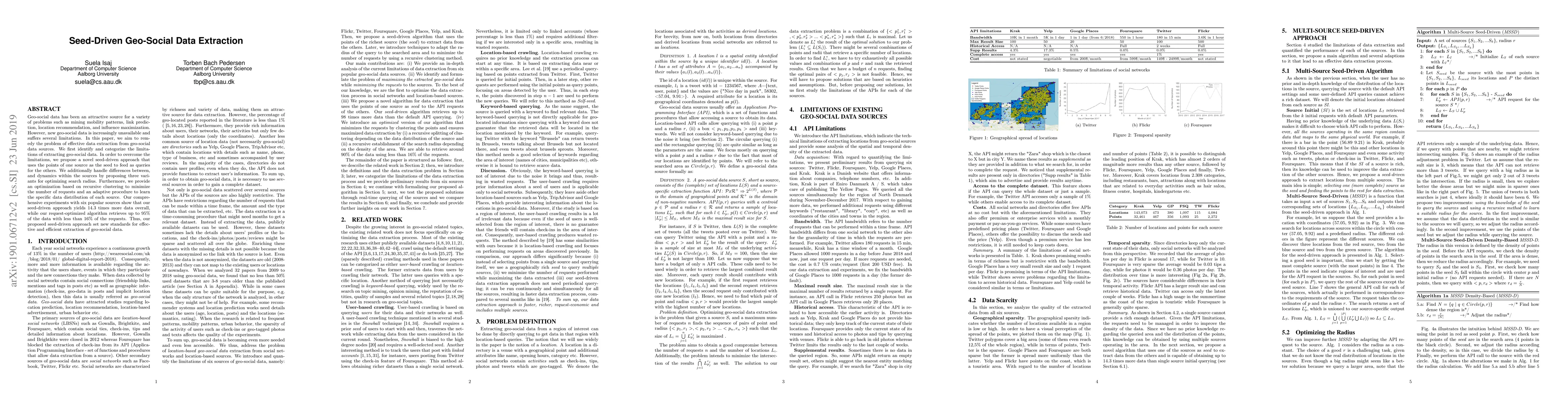 This paper proposes a seed-driven approach to extract geo-social data, addressing its limitations by using points from one source as queries to others. The method optimizes search radius and employs recursive clustering to minimize requests, achieving 14.3 times more data extraction with up to 95% data retrieval using less than 16% of the requests.