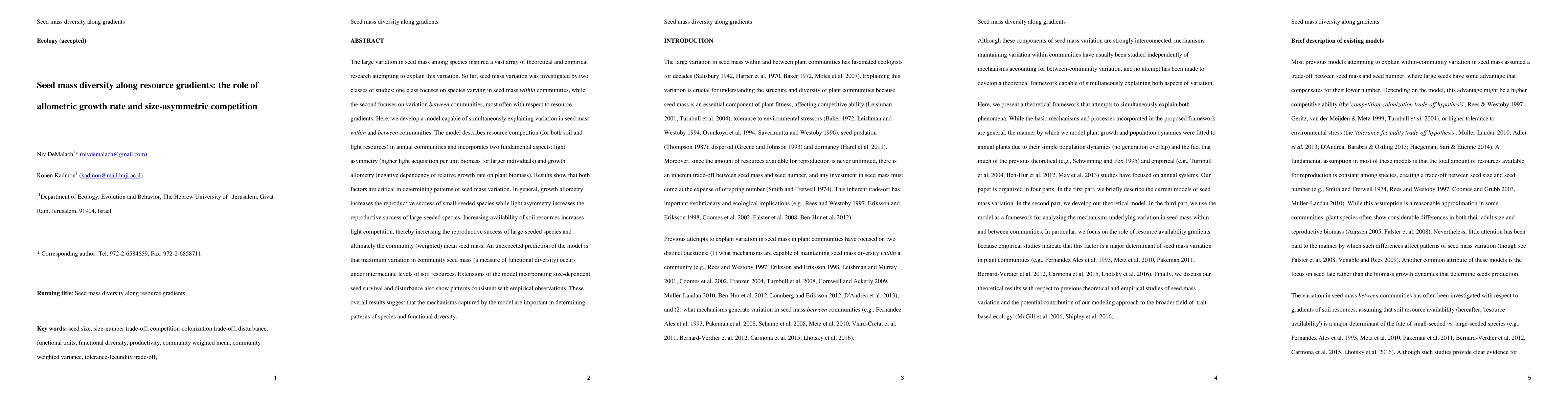 This paper develops a model to explain seed mass variation within and between communities, emphasizing the roles of allometric growth rate and size-asymmetric competition. The model predicts that growth allometry favors small-seeded species, while light asymmetry favors large-seeded species, with intermediate soil resource levels maximizing community seed mass diversity.
