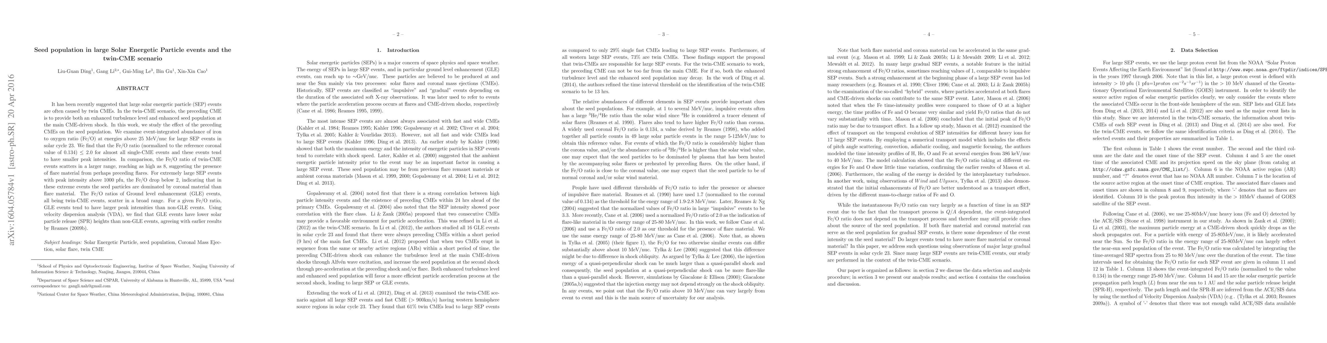 This study investigates the seed population in large solar energetic particle events, particularly focusing on the twin-CME scenario. The Fe/O ratio for twin-CME events is significantly higher, suggesting the influence of preceding flares, while extreme events show a dominance of coronal material. Ground level enhancement events, all twin-CMEs, exhibit a broad range of Fe/O ratios and higher peak intensities.