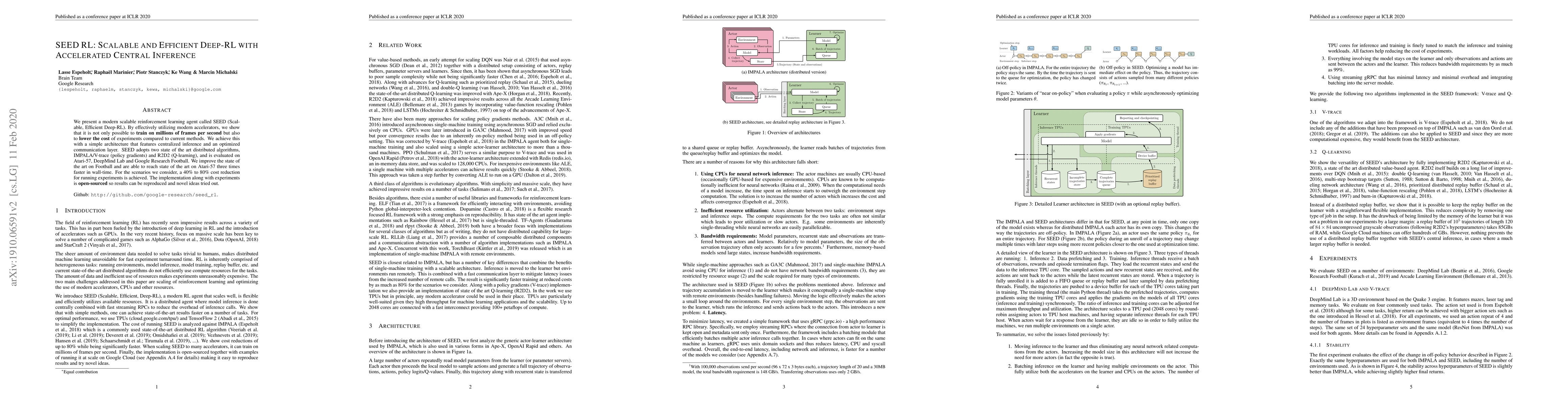 We present a modern scalable reinforcement learning agent called SEED (Scalable, Efficient Deep-RL). By effectively utilizing modern accelerators, we show that it is not only possible to train on millions of frames per second but also to lower the cost of experiments compared to current methods. We achieve this with a simple architecture that features centralized inference and an optimized communication layer. SEED adopts two state of the art distributed algorithms, IMPALA/V-trace (policy gradients) and R2D2 (Q-learning), and is evaluated on Atari-57, DeepMind Lab and Google Research Football. We improve the state of the art on Football and are able to reach state of the art on Atari-57 three times faster in wall-time. For the scenarios we consider, a 40% to 80% cost reduction for running experiments is achieved. The implementation along with experiments is open-sourced so results can be reproduced and novel ideas tried out.