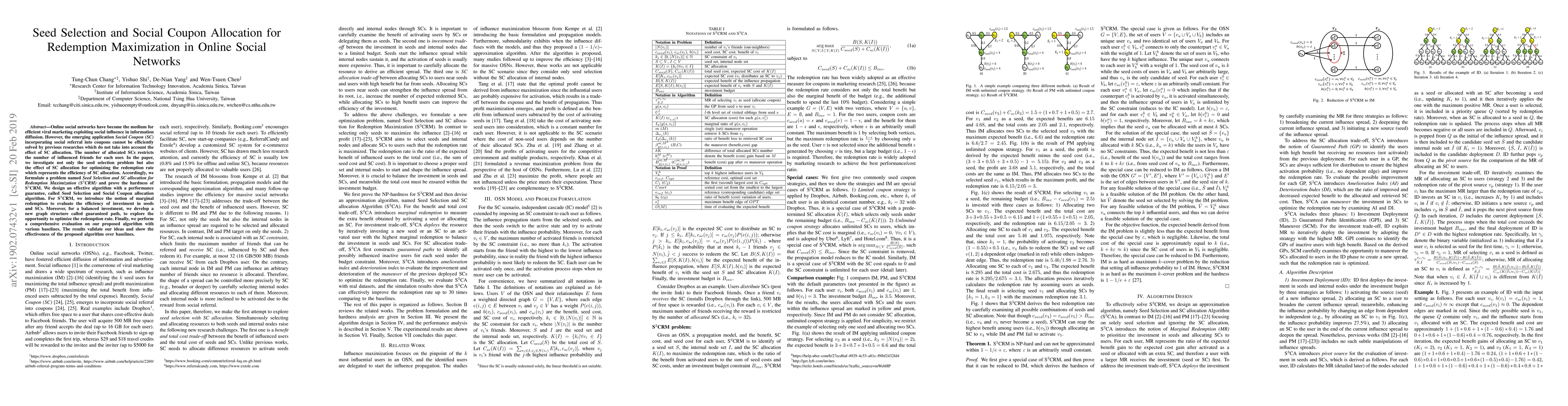 This paper investigates the Seed Selection and Social Coupon Allocation for Redemption Maximization (S3CRM) in online social networks, proposing a new algorithm to optimize the redemption rate by efficiently selecting seeds and allocating social coupons. The study introduces the concept of marginal redemption and a new graph structure called guaranteed path to balance investment and optimize redemption rates, demonstrating superior performance over baselines.