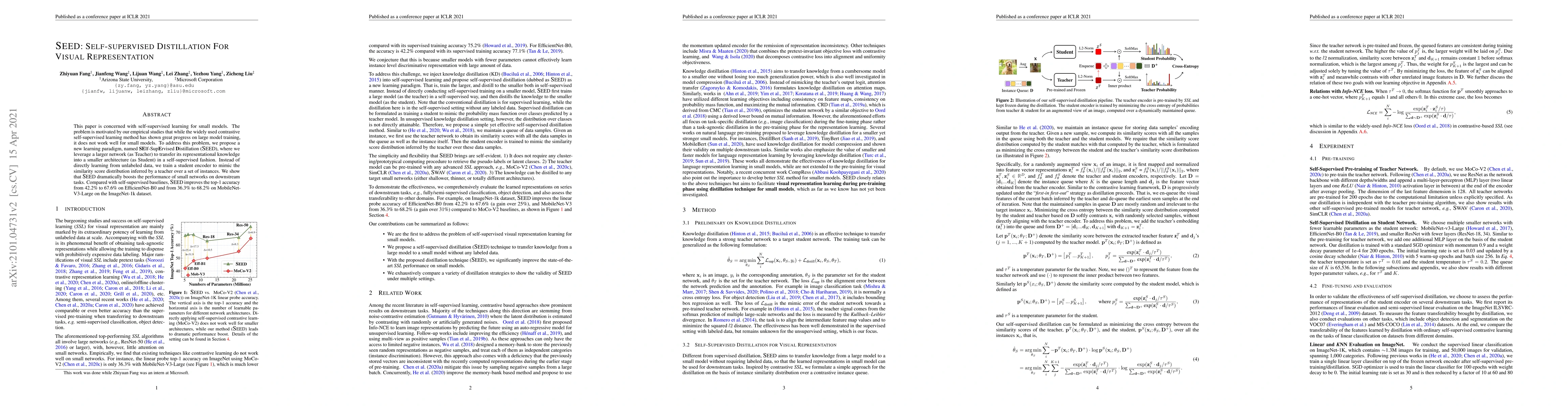 A new self-supervised learning method called SEED improves small model performance on downstream tasks by leveraging a larger network to transfer its knowledge into smaller architectures.